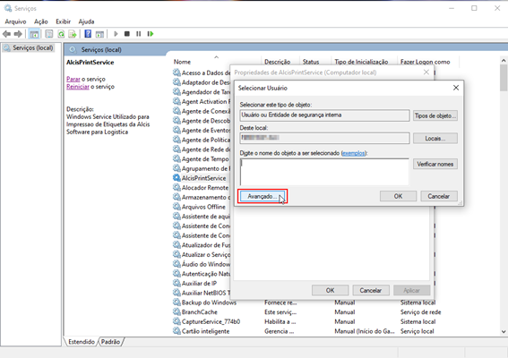 4. Quando o serviço for instalado em um servidor, devemos alterar o usuário na aba Logon para o Administrador da máquina. Para redes com AD, pode ocorrer de a comunicação com a impressora e/ou internet ser bloqueada por alguma política de rede. Neste caso, deve-se informar um usuário administrador de rede para que o serviço funcione adequadamente.