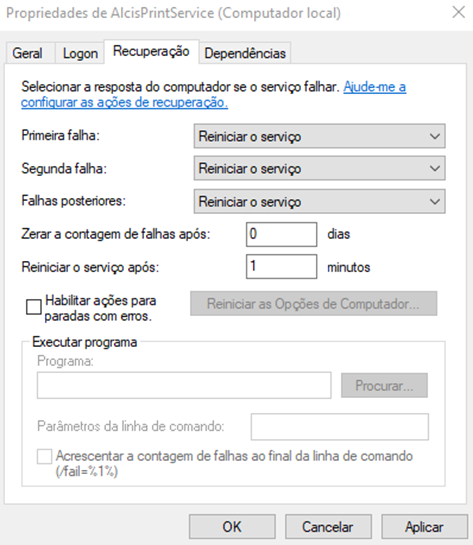 3. No serviço AlcisPrintService, clique com botão direito no serviço e vá até Propriedades, onde abrirá a tela a seguir.