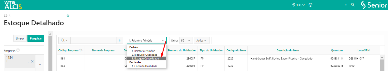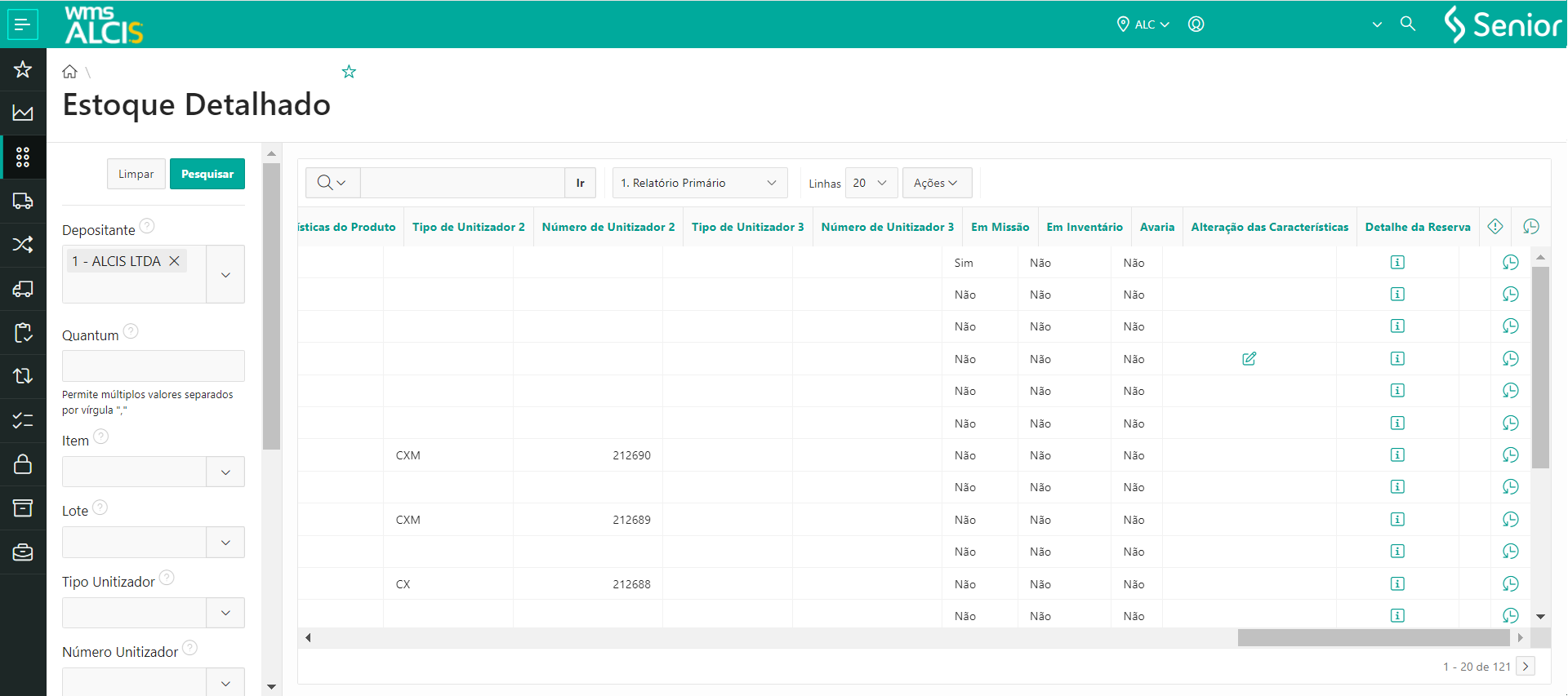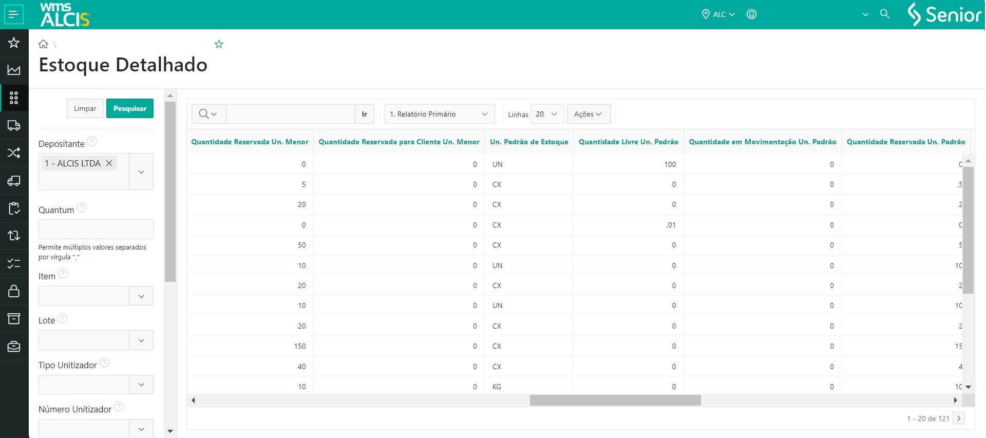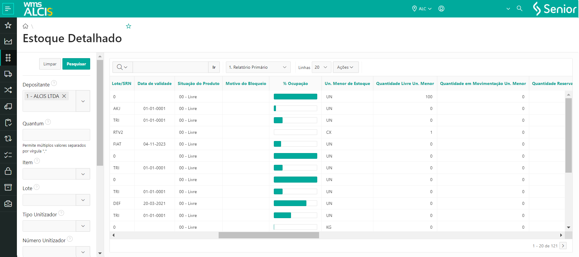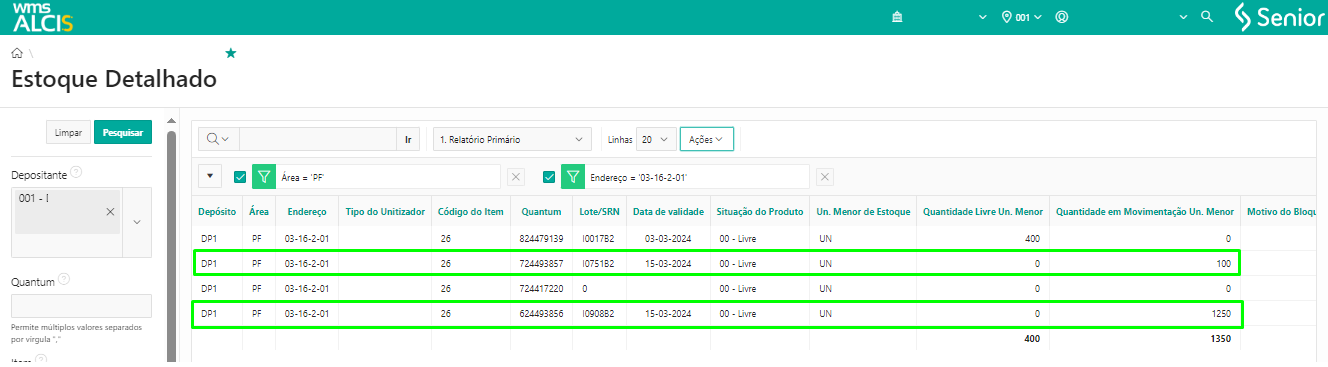 - Em WMS > Gestão do Estoque > Estoque Detalhado (LS200)