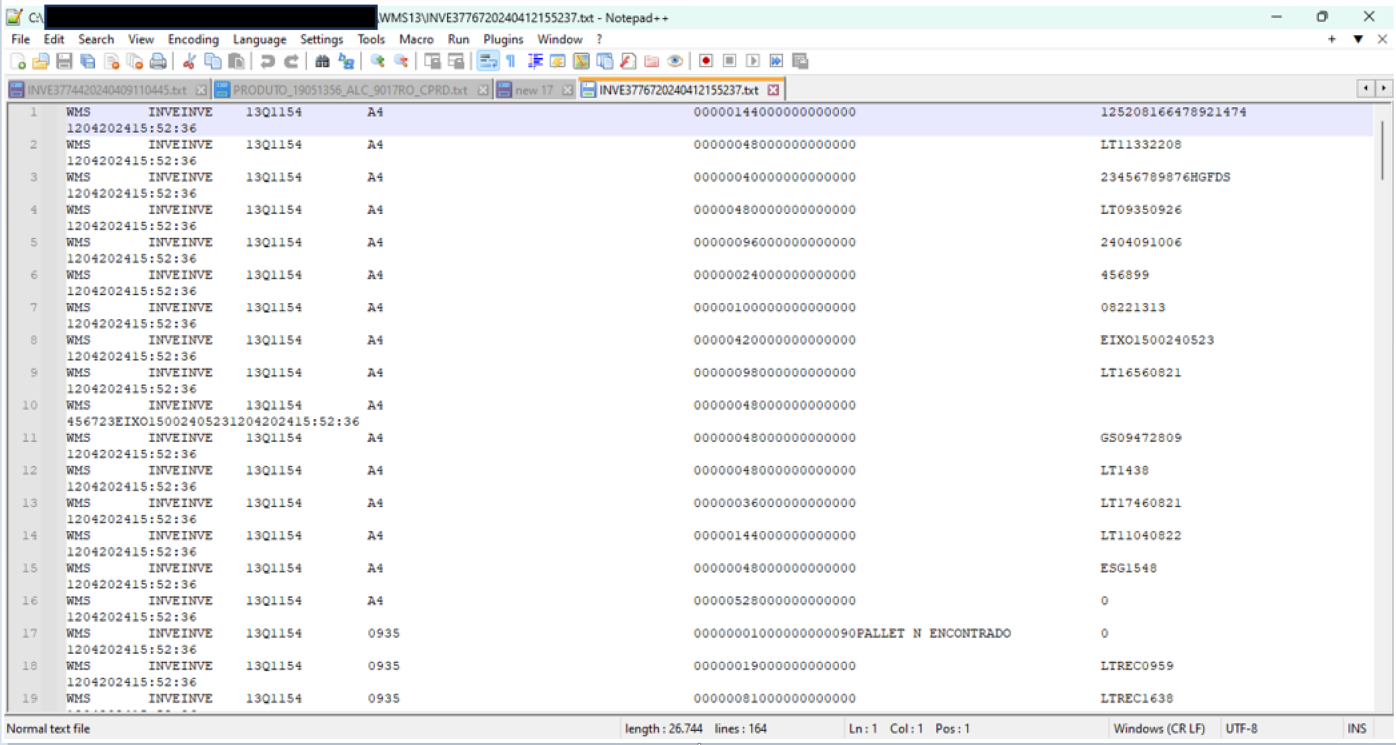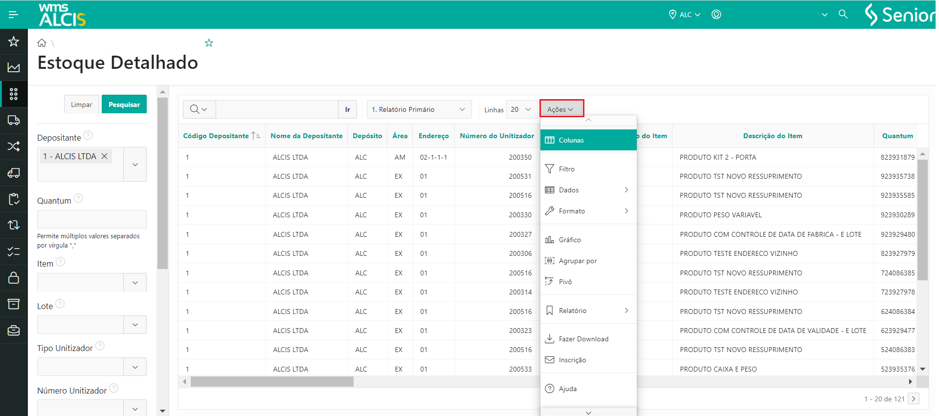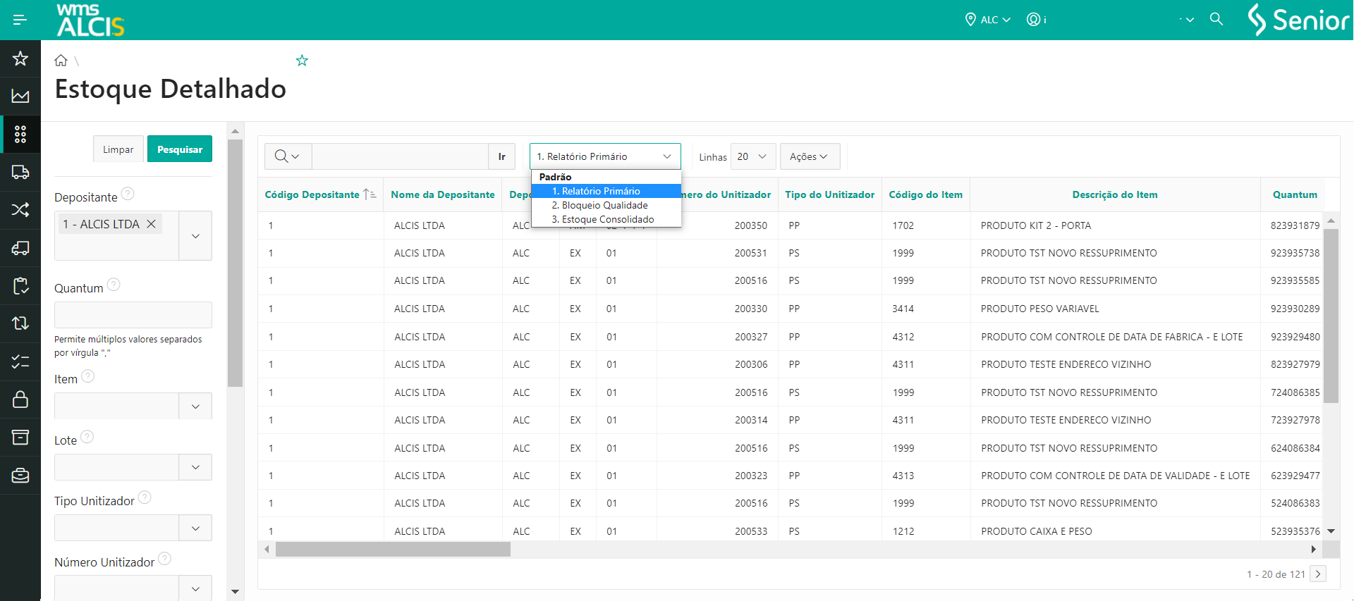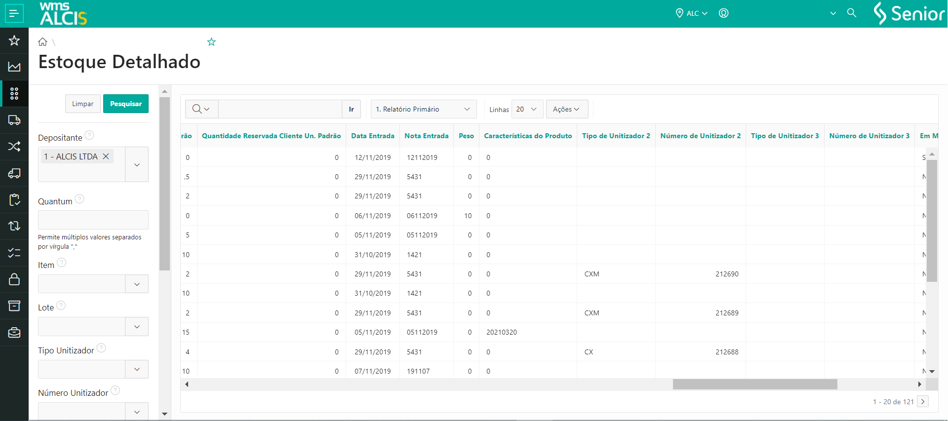 - Em WMS > Gestão do Estoque > Estoque Detalhado (LS200)