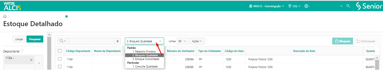 O processo de bloqueio e desbloqueio se encontra dentro dos processos de estoque detalhado, que pode ser acessado através do menu WMS > Gestão de Estoque > Estoque Detalhado ou da busca universal. Após realizar uma consulta menu de filtros laterais, no grid de consultas, nas opções de relatórios, é necessário selecionar a opção 2-Bloqueio Qualidade.