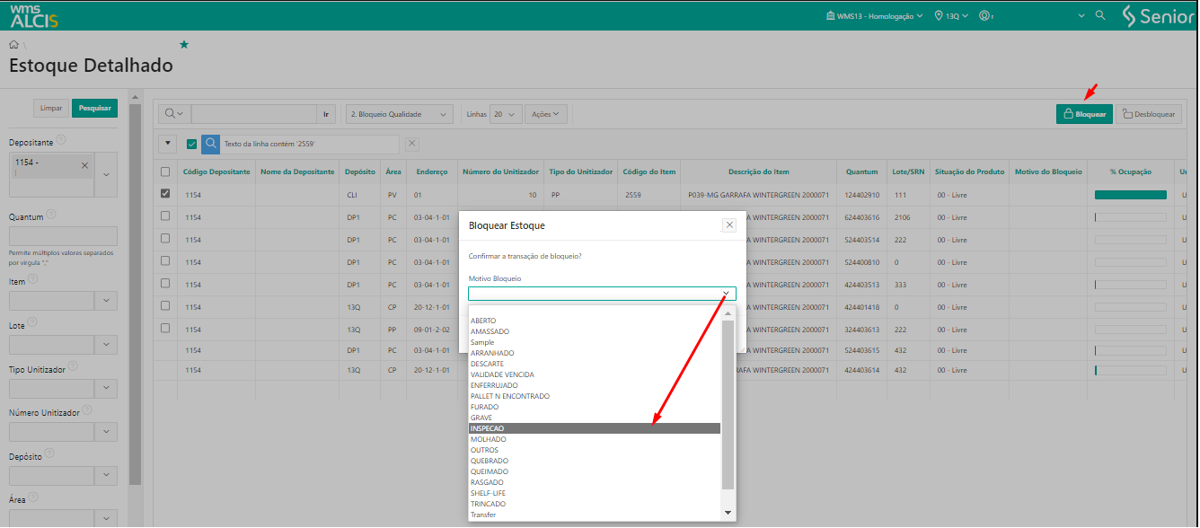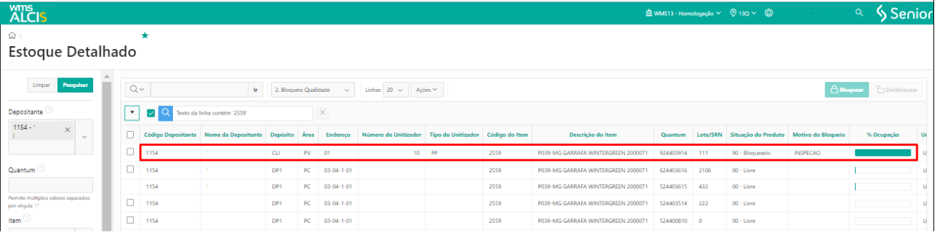 Esse processo pode ser acessado através do menu WMS > Gestão de Estoque > Estoque Detalhado ou da busca universal, e após realizar uma consulta menu de filtros laterais, no grid de consultas, nas opções de relatórios, é necessário selecionar a opção 2-Bloqueio Qualidade.