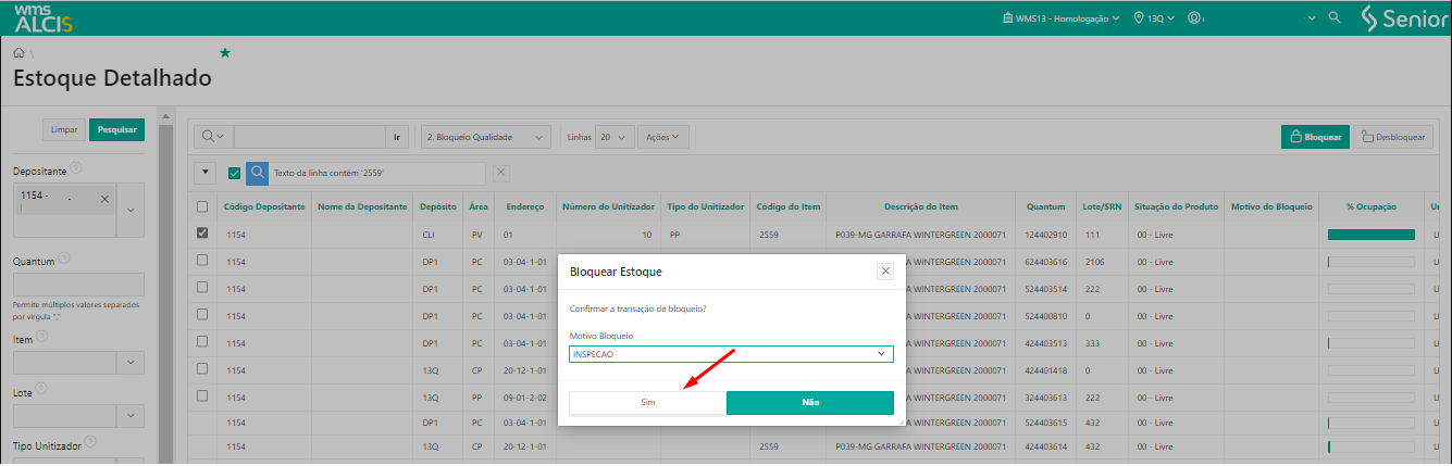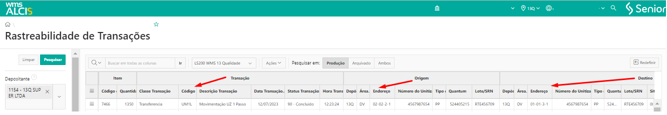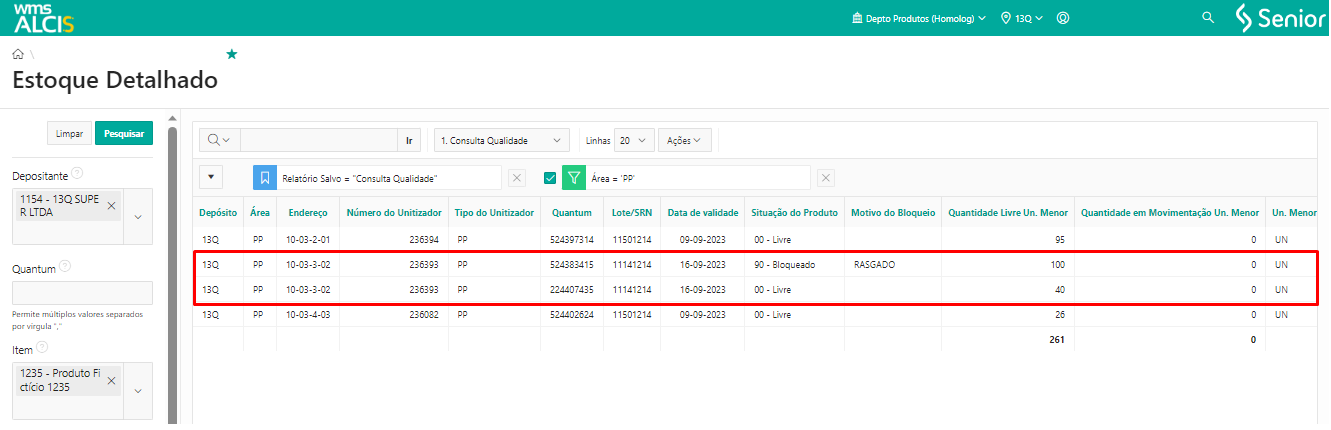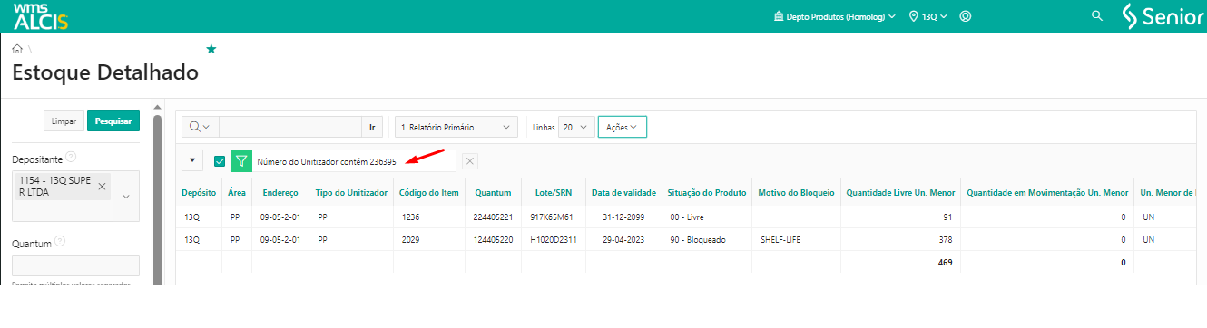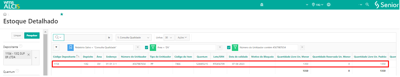 Depois de finalizado o processo de transferência de UZ, na tela de Estoque Detalhado (LS200), utilizando os filtros Depositante e Unitizador, verificar que o unitizador a UZ 4567987654 está no endereço 13Q-DV-01-01-3-1.