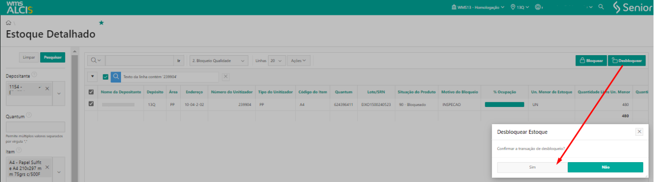 Com o produto desejado localizado, é necessário selecionar a linha do registro, utilizar o botão Desbloquear e confirmar o processo de desbloqueio. Com a atualização da tela a alteração do registro na coluna Situação do Produto ficará indicada com o status 00 - Livre.