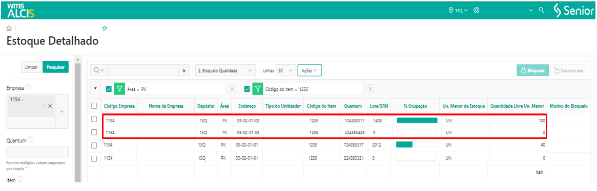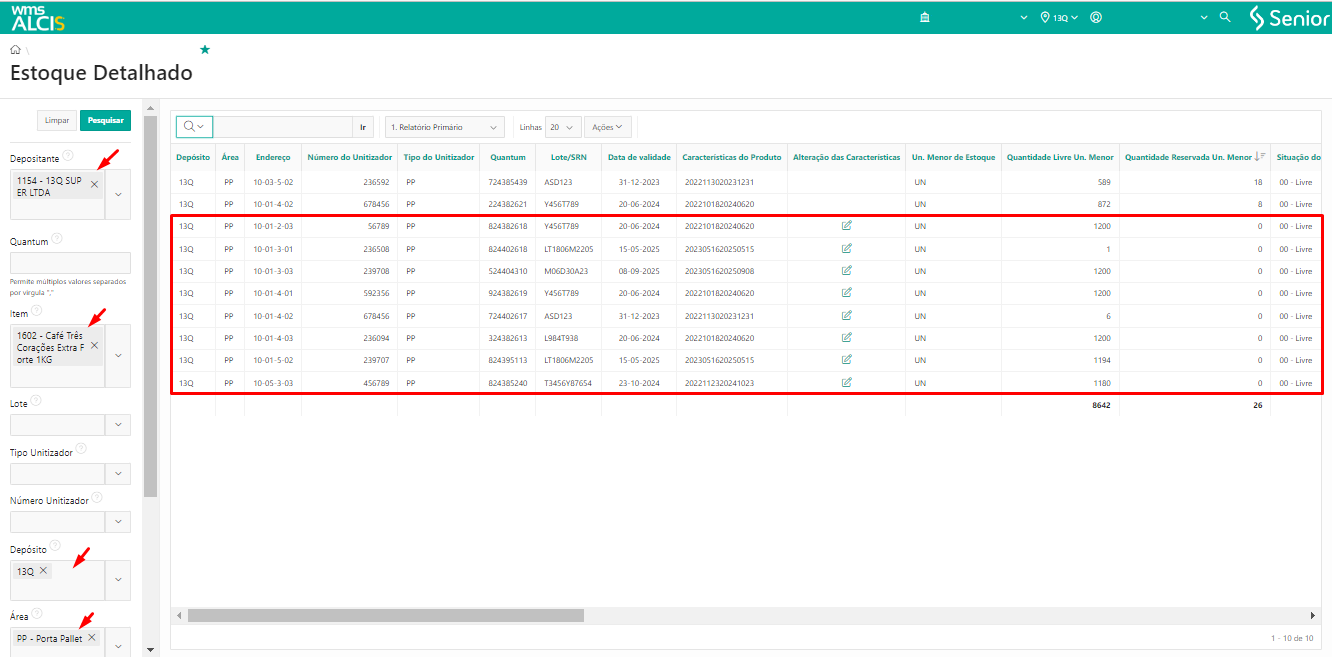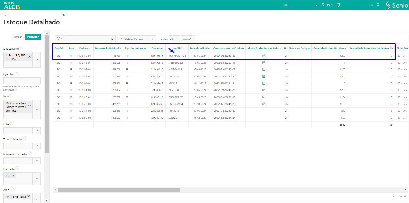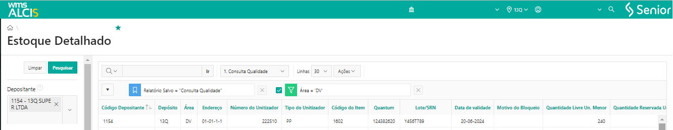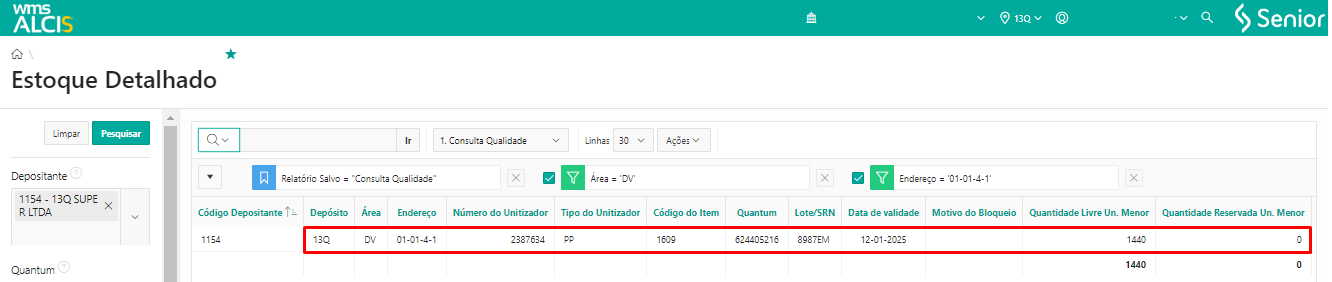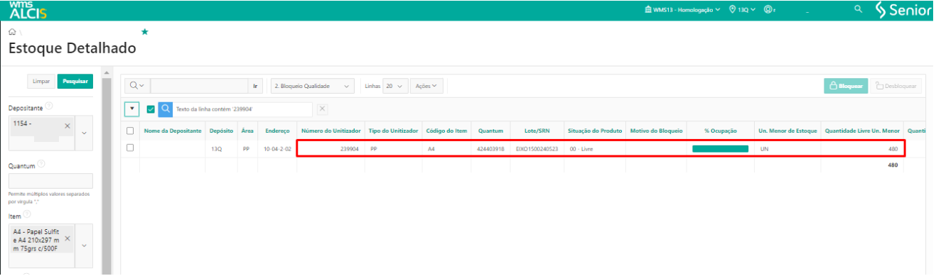 Consultando a tela de Estoque Detalhado (LS200) usando os filtros Depositante e Unitizador, podemos verificar que o unitizador nº 222510 agora está no endereço 13Q-DV-01-01-4-1.