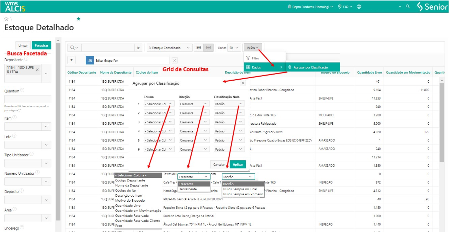 (Exibir grupo por). Além disso você pode refinar ainda mais a consulta através do grid de consultas utilizando as opções Ações > Dados > Agrupar por Classificação e selecionar os campos conforme a necessidade que devem aparecer, como por exemplo por Código do Item.