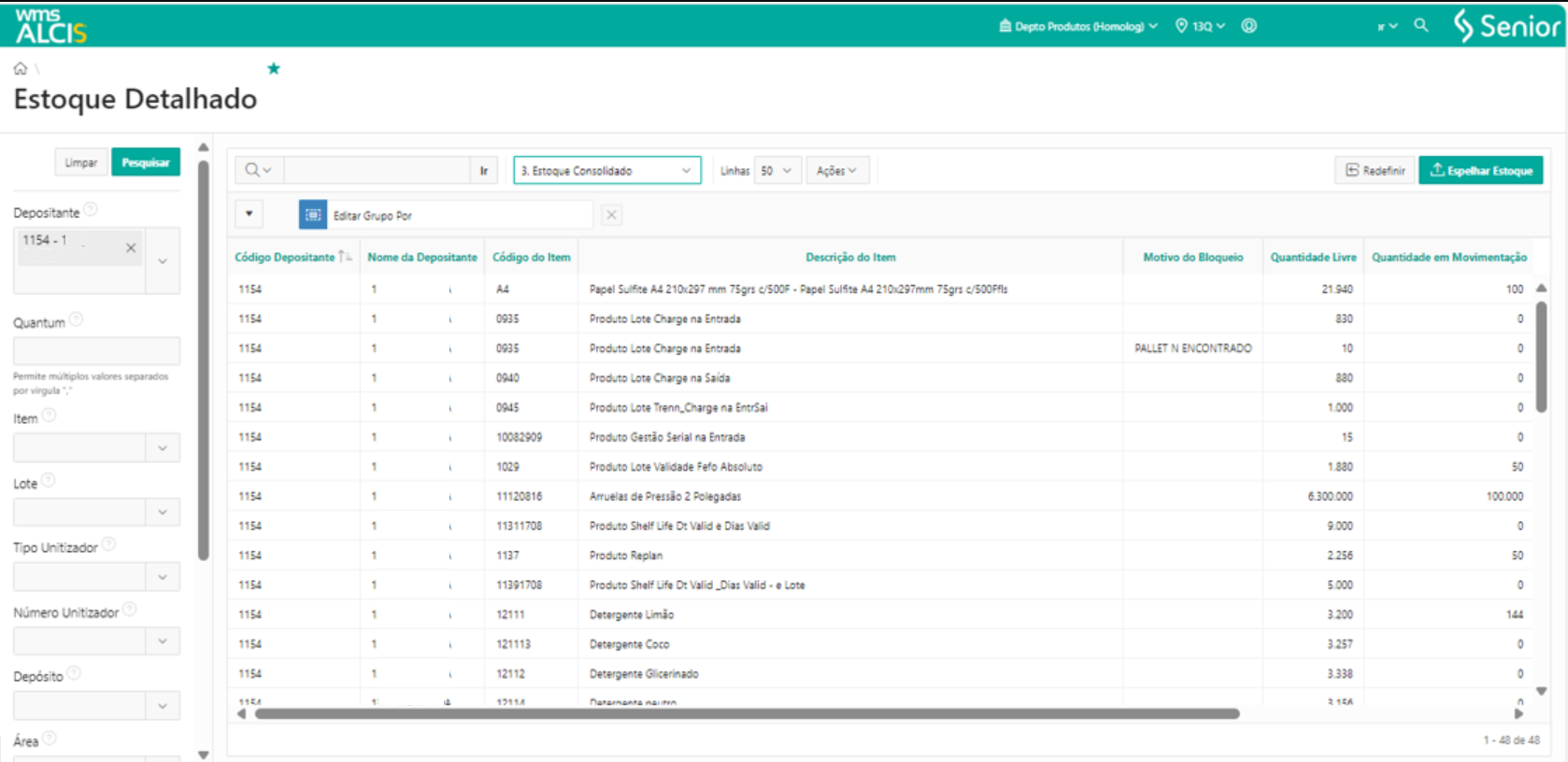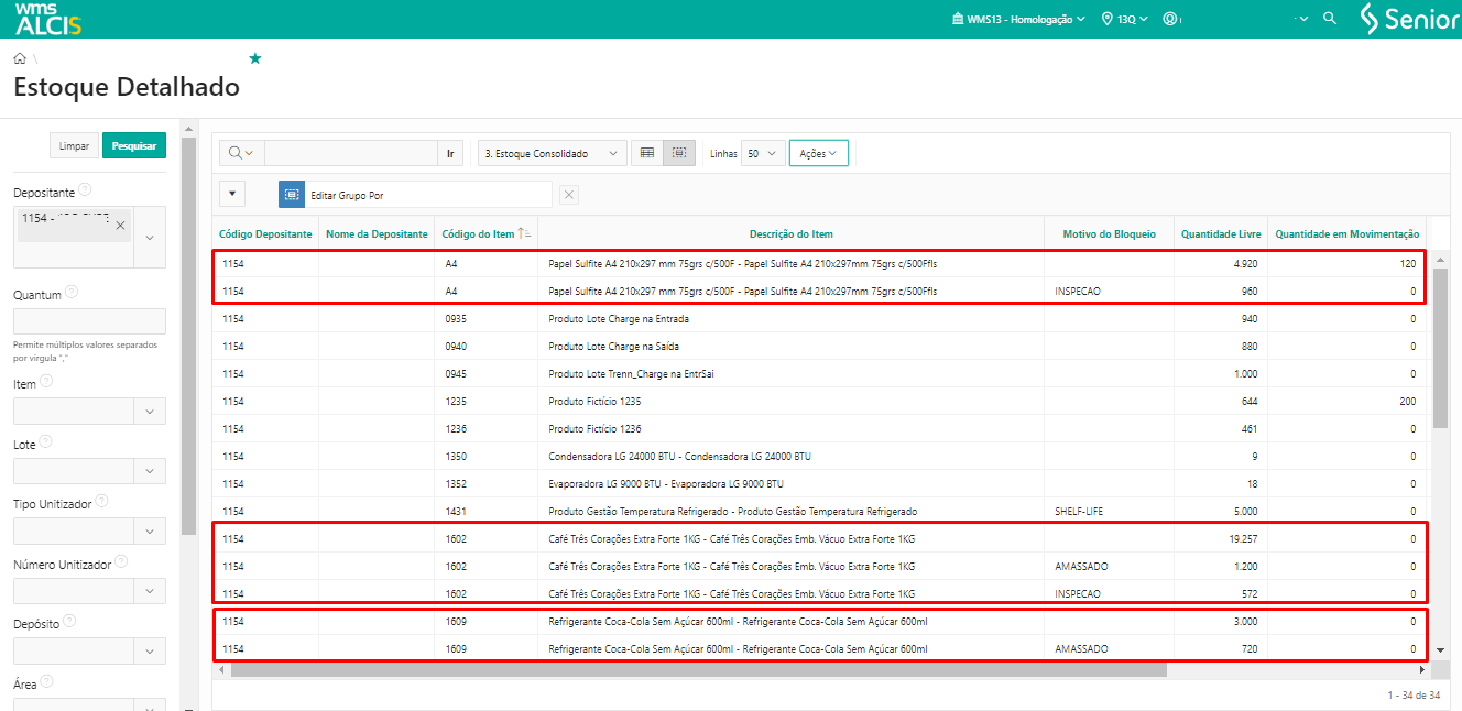A consulta de estoque consolidado tem como objetivo dar uma visão gerencial do estoque total por tipos de salto: disponível, empenhado ou bloqueado.