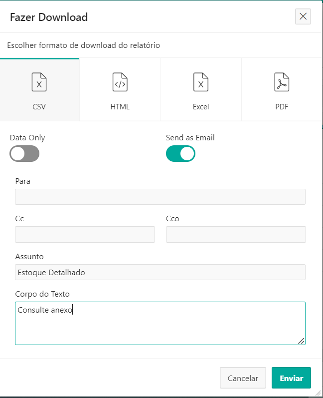 Além da possibilidade de salvar os relatórios, também pode-se efetuar o download, escolher o formato de download e até mesmo enviar por e-mail. Ao clicar em Fazer Download e ativar o campo Send as E-mail será aberta uma tela Fazer Download para preenchimento de dados campos para o envio de e-mail.