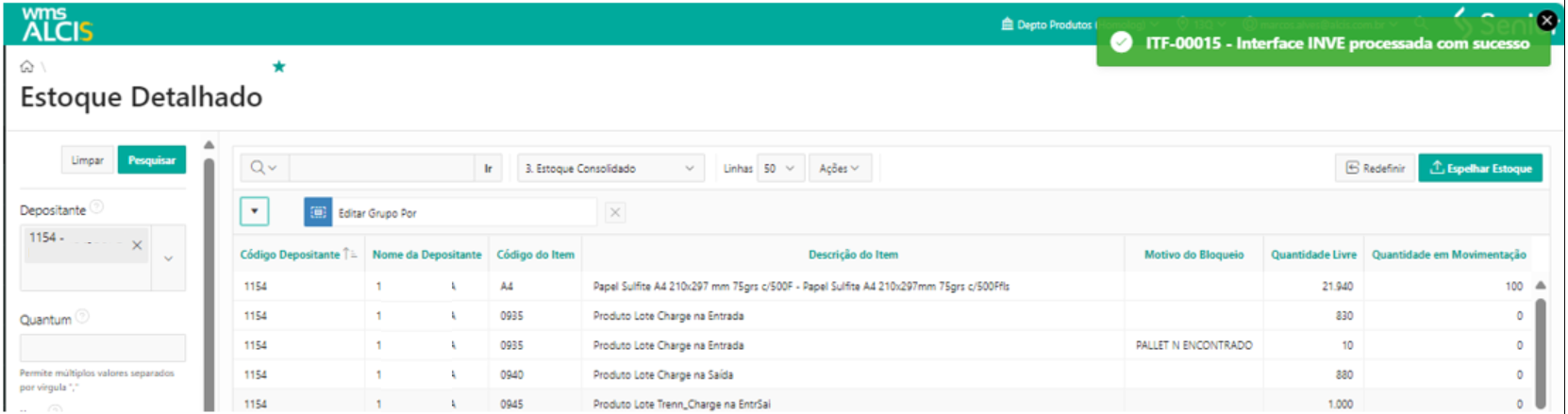 Para gerar a integração, primeiro é necessário acessar a tela de Estoque Detalhado (LS200) e filtrar por 3. Estoque Consolidado. Em seguida, utilize o botão Espelhar Estoque, que exibirá a sub tela Batimento Estoque. Nessa sub tela, selecione o Depositante apropriado e clique no botão Confirmar. Após essa confirmação, a tela será atualizada e exibirá uma mensagem informando que a interface INVE foi processada com sucesso.