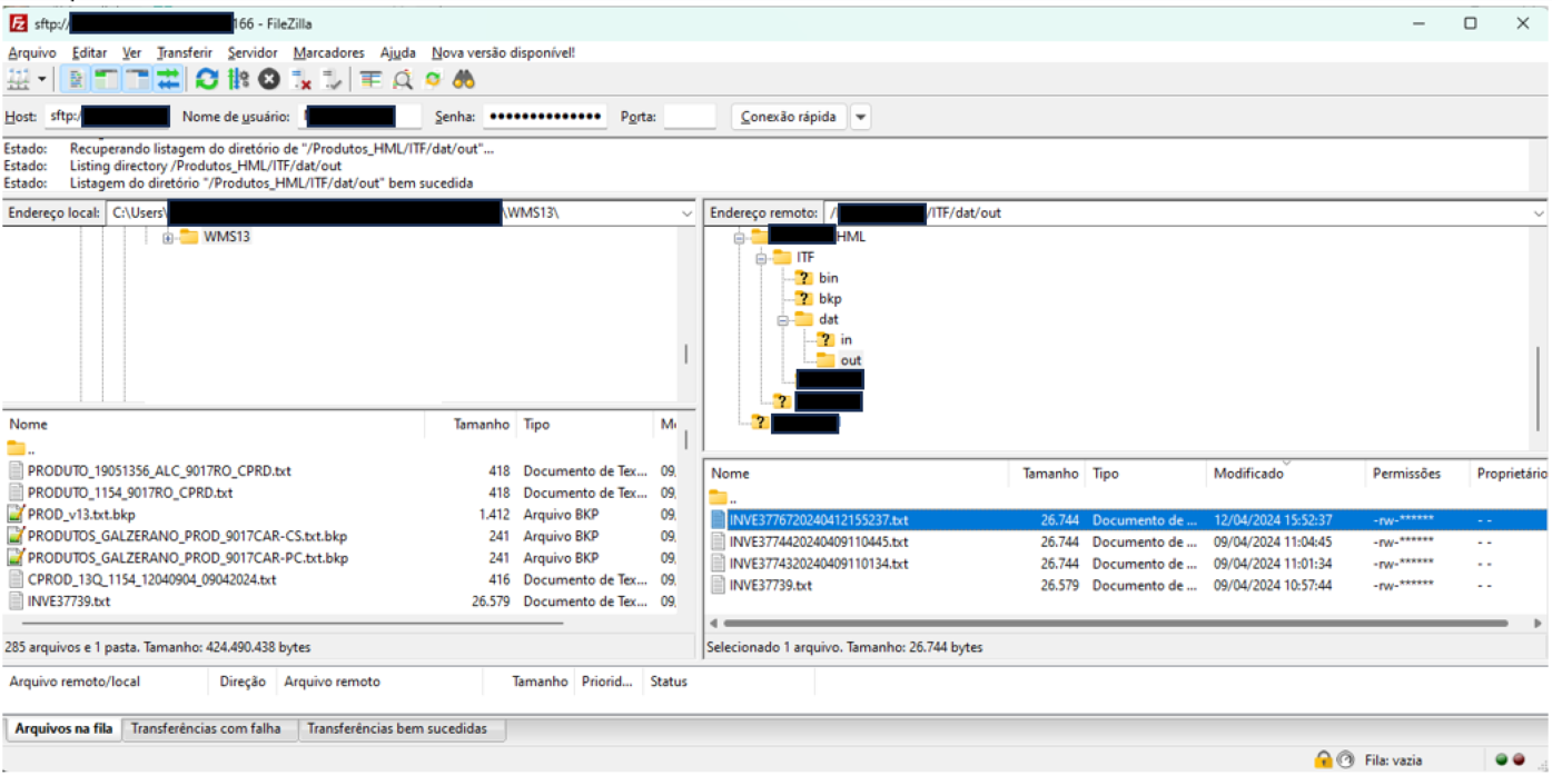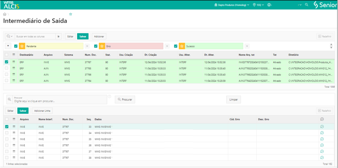 Para verificar se a integração foi bem-sucedida, utilize a tela Intermediário de Saída (SY450-Out). Nessa tela, você verá um registro da interface INVE, que estará destacado em verde, indicando que a interface foi gerada com sucesso. Além disso, será mostrado o nome do arquivo .txt gerado e o caminho do diretório onde o arquivo está armazenado, nas colunas correspondentes.