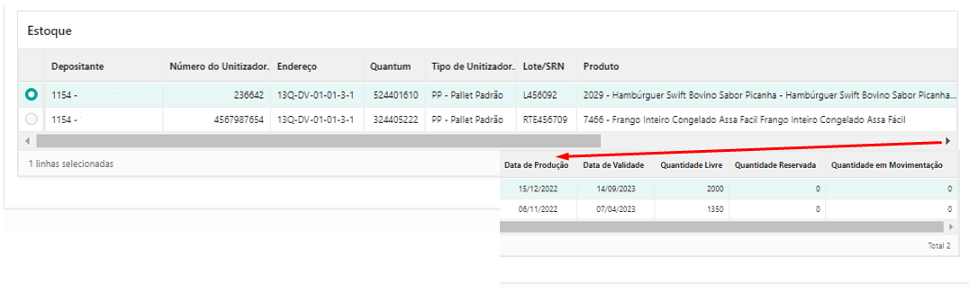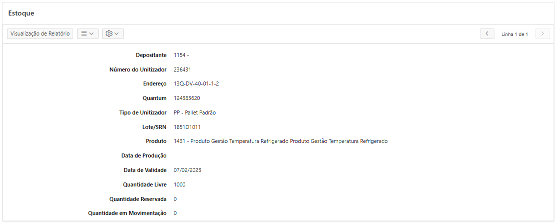 No campo Estoque serão exibidos os detalhes do(s) item(ns) de acordo com o filtro utilizado no campo Identificação de Estoque. A apresentação dos registros pode ocorrer de duas maneiras: