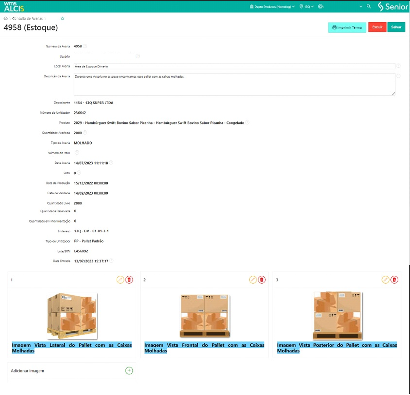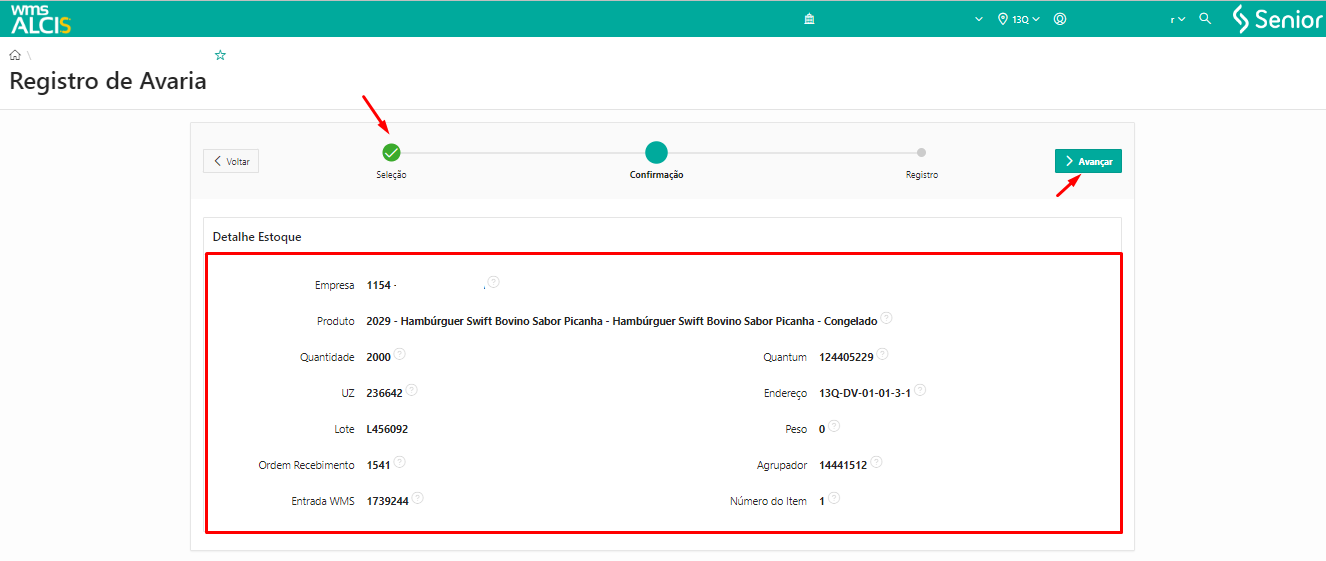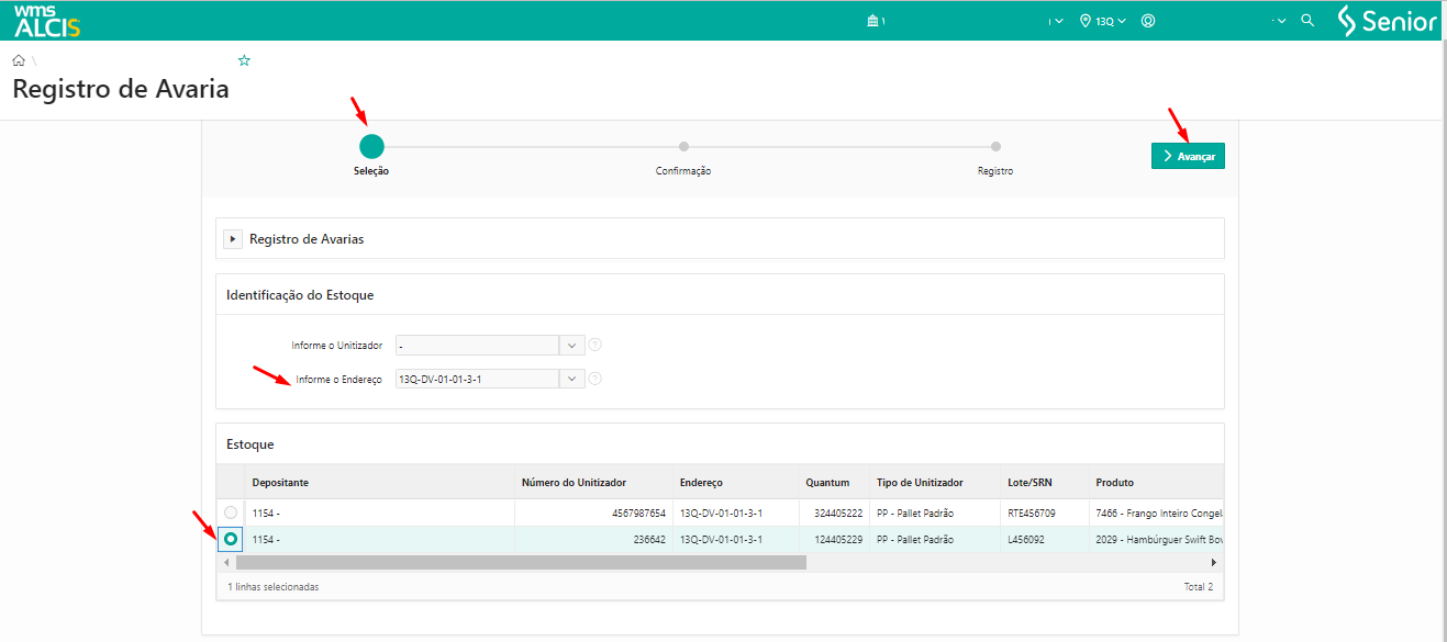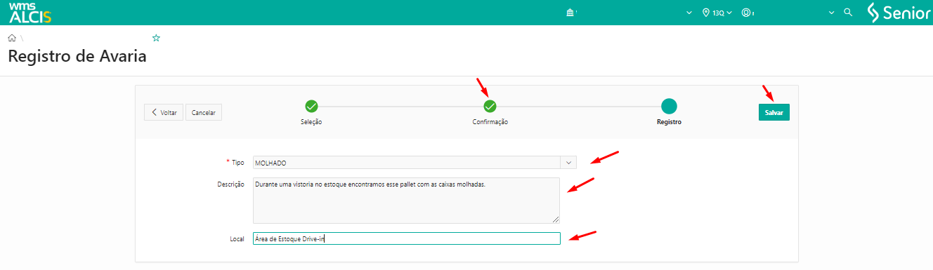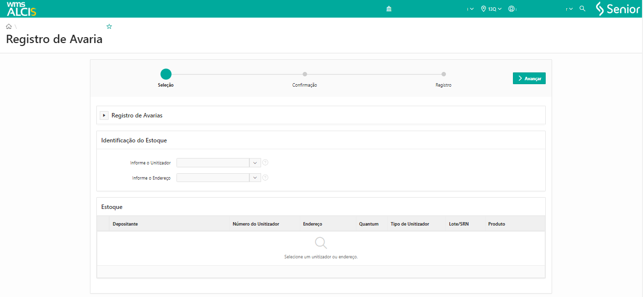- Registre avarias de estoque informando um endereço ou um unitizador.
