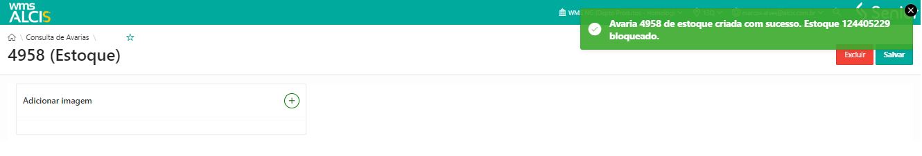 Após a inserção de informações sobre a avaria e clicar em Salvar, o sistema irá atualizar a tela do número de registro da avaria, com mensagem informando que a avaria foi criada e a indicação que o Estoque do quantum foi bloqueado.