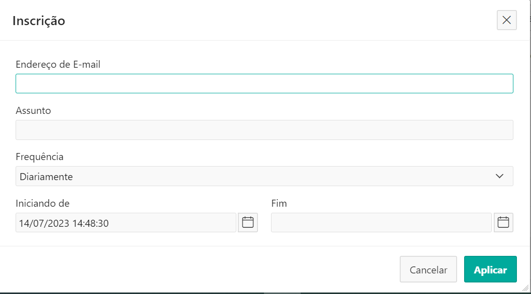 Pode-se criar também uma rotina de envio de e-mail com a consulta de estoque detalhado, definindo uma frequência e um período de inicio e fim, através clicando em Ações > Inscrição