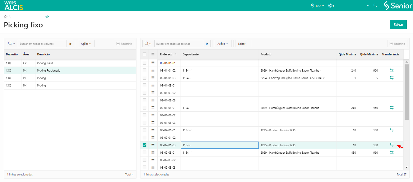 - Os campos Depósito, Área e Endereço de picking fixo devem estar configurados com: