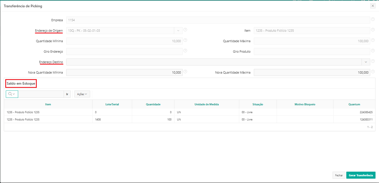 - Informe o Endereço: lista todos os endereços de estoque ou permite inserir o endereço