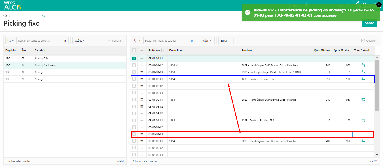 - Os campos Depósito, Área e Endereço de picking fixo deve exibir as informações do produto configurado na tela > Picking fixo (SD269).
