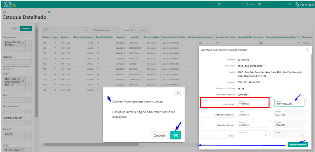 Nesse exemplo, ao trocar as informações do campo Lote/Serial do produto de Y756T789 para L0307T1324A23 e clicar no botão Atualizar Atributos, o sistema apresentará uma mensagem de confirmação de alteração das caraterísticas, e em seguida podemos verificar na tela de Estoque Detalhado que o Lote do quantum foi alterado.
