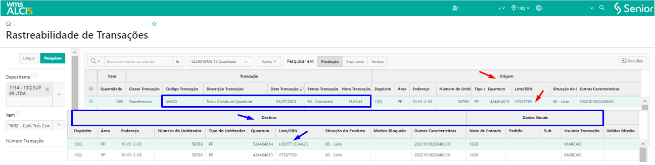 Esse processo irá gerar um registro de transação UMCD – Troca Divisão de Quantum que pode ser consultado em WMS > Gestão de Estoque > Rastreabilidade de Transações.