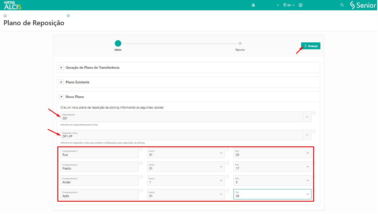 Acessar Reposição > Planejamento > Plano de Reposição e em Novo Plano preencher os campos Depositante e Depósito-Área. Após preencher esses campos, informar os range de endereço Início e Fim de cada componente e clicar em Avançar.