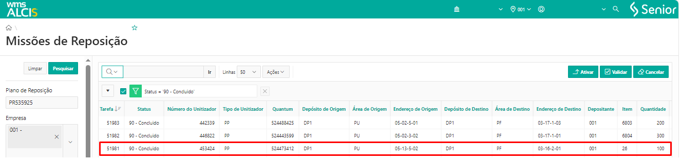 Ao retornar para a tela Missões de Reposição (NA400) e atualizar a consulta é possível verificar que a tarefa 51981 agora tem o Status 90 – Concluído.
