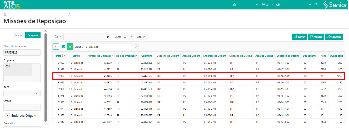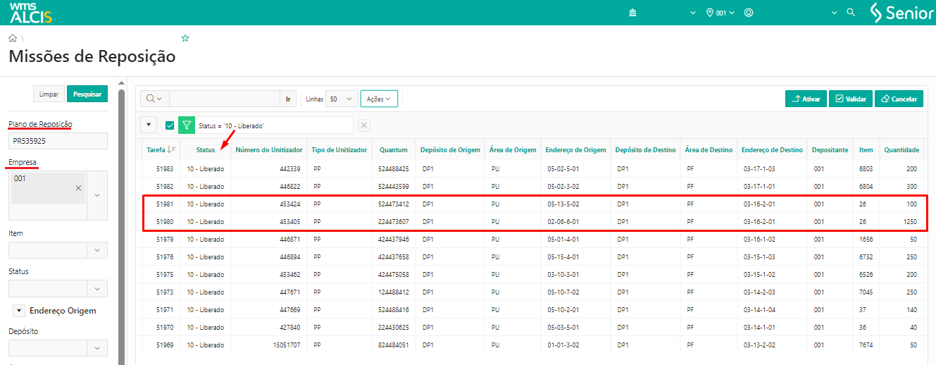 Na tela Missões de Reposição (NA400), através dos filtros Plano de Reposição, Empresa e clicar em Pesquisar, tem-se acesso as tarefas do PR desejado. Ao refinar a busca atraves do campo Status, é possivel ordenar as tarefas pelo status 10-Liberado, a fim de visualizar apenas as tarefas de reposição que estão liberadas para serem realizadas. Para o exemplo, será utilizado as tarefas 51981 e 52980 que tem o mesmo endereço de destino, porém com endereços de origem diferentes.