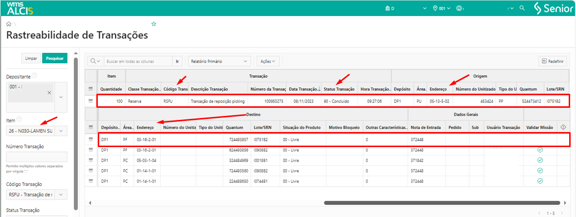 Para validar o sucesso do processo de reposição realizado, pode-se consultar a tela Rastreabilidade de Transações (LS300) através do filtro Empresa, Item e Transação, e verificar que a transação que antes estava como estava com o status 10 – Em Aberto agora tem status 90 – Concluído.