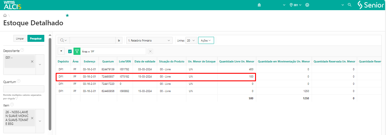 Por fim, ao acessar a tela Estoque Detalhado (LS200) e aplicar os filtros Empresa, Item e Área, podemos verificar a alteração da quantidade 100, referente ao Lote/SRN I075182, anteriormente estava listado na coluna Quantidade em Movimentação Un. Menor, agora está na coluna Quantidade Livre Un. Menor.