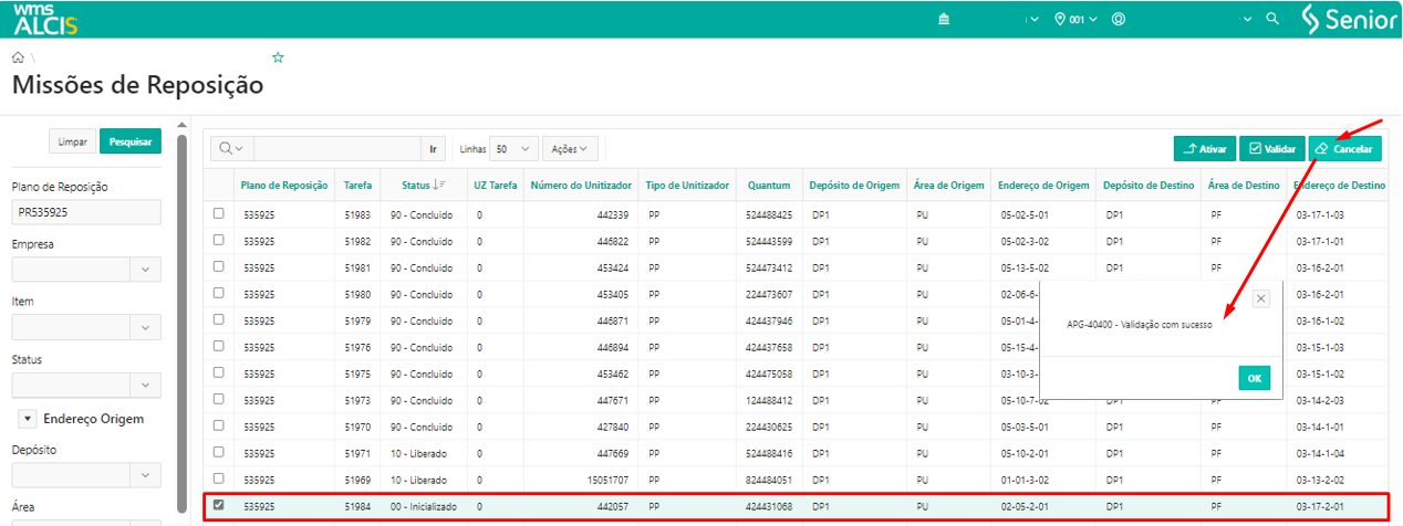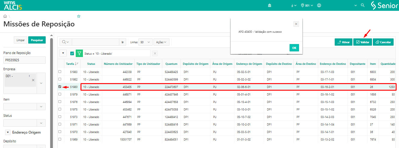 Para validar uma tarefa, selecionar a tarefa desejada clicando no ícone e, em seguida, clicar no botão Validar. Uma mensagem de confirmação, APG-40400 - Validação com sucesso,será exibida. Basta clicar em Ok e a reposição estará concluída.
