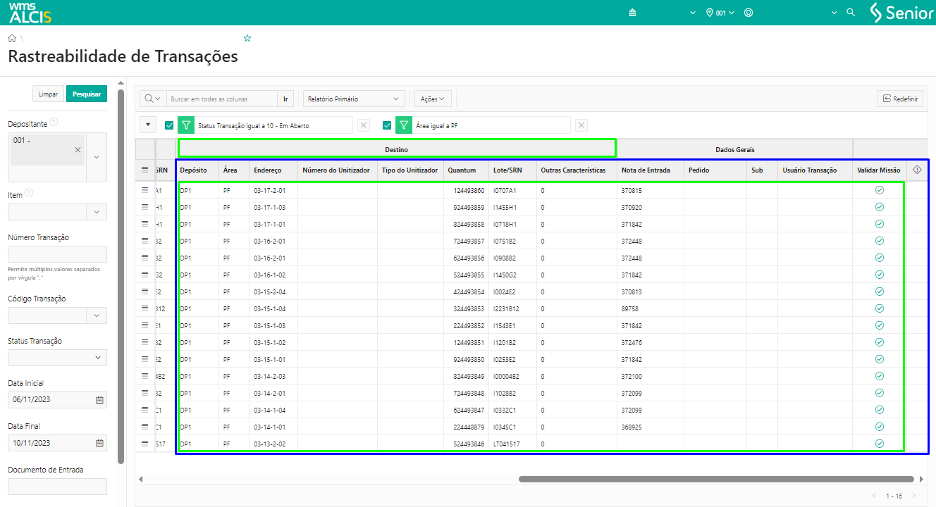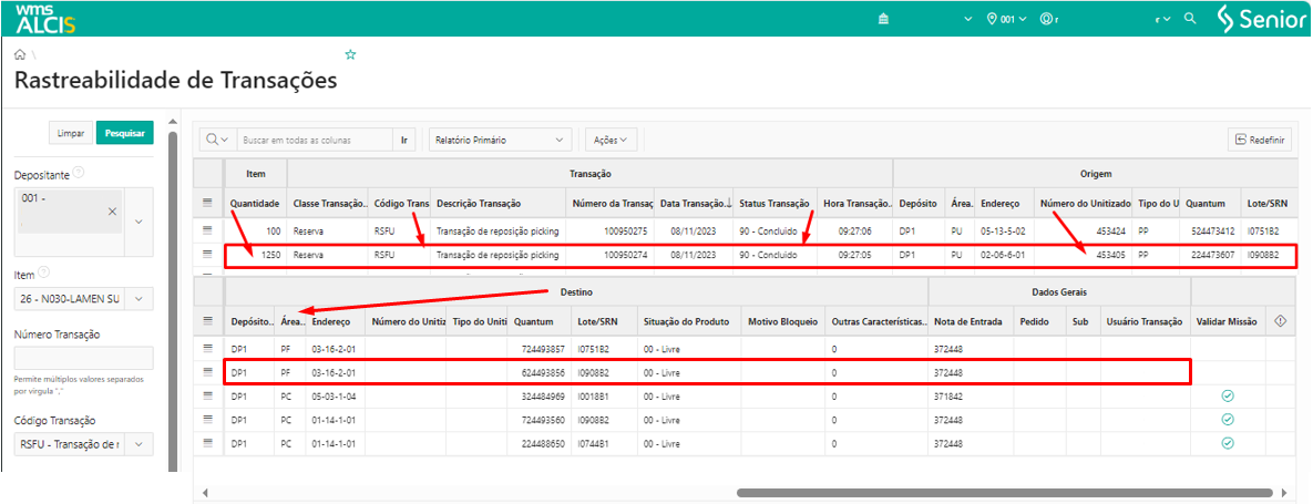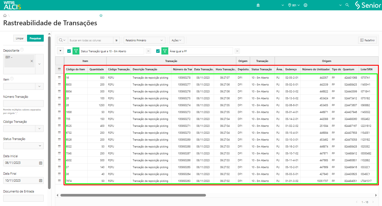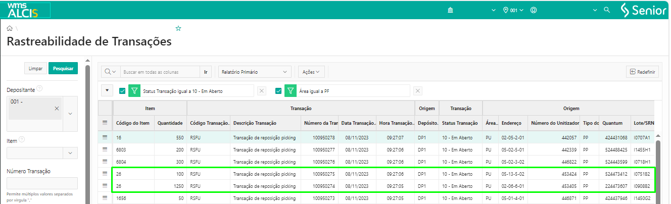 Ao consultar a tela Rastreabilidade de Transações (LS300), pelo menu WMS > Gestão do Estoque, com os filtros da grid Transação > Status Transação igual a 10-Em Aberto e em Destino > Área igual a PF, verificamos que foram geradas 16 transações do tipo RSFU – Transação de reposição picking.