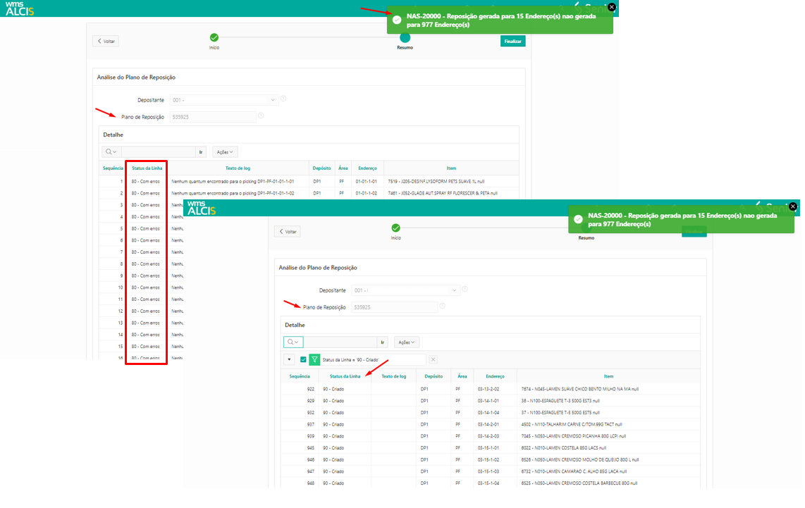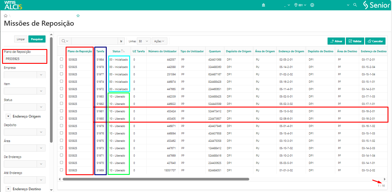 No exemplo da imagem acima, na tela Missões de Reposição (NA400) pode-se observar que, para o plano de reposição PR53925, a mensagem indica que foram gerados 15 (quinze) endereços, mas ao observar no canto inferior direito da tabela temos listados 16 (dezesseis) registros. Essa diferença ocorre pois o endereço de destino, DP1 PF 03-16-2-01, tem 2 (duas) tarefas: 51980 e a 51981.