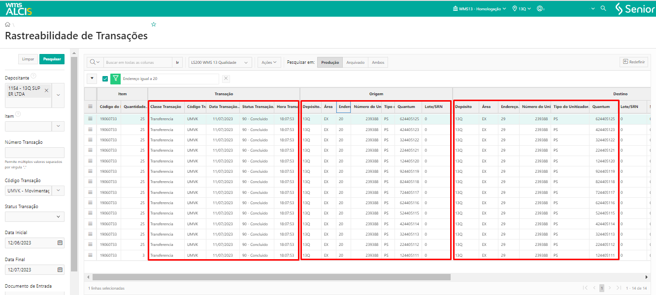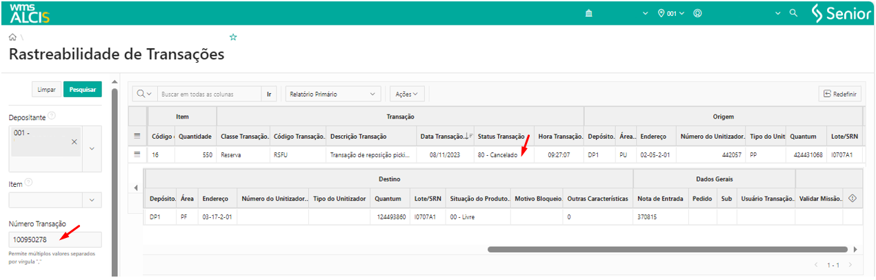 Também é possível verificar se o processo foi efetuado através do menu WMS > Gestão do Estoque > Rastreabilidade de Transações (LS300), filtrar pelo Número de Transação, que o Status estará como 80 – Cancelado.