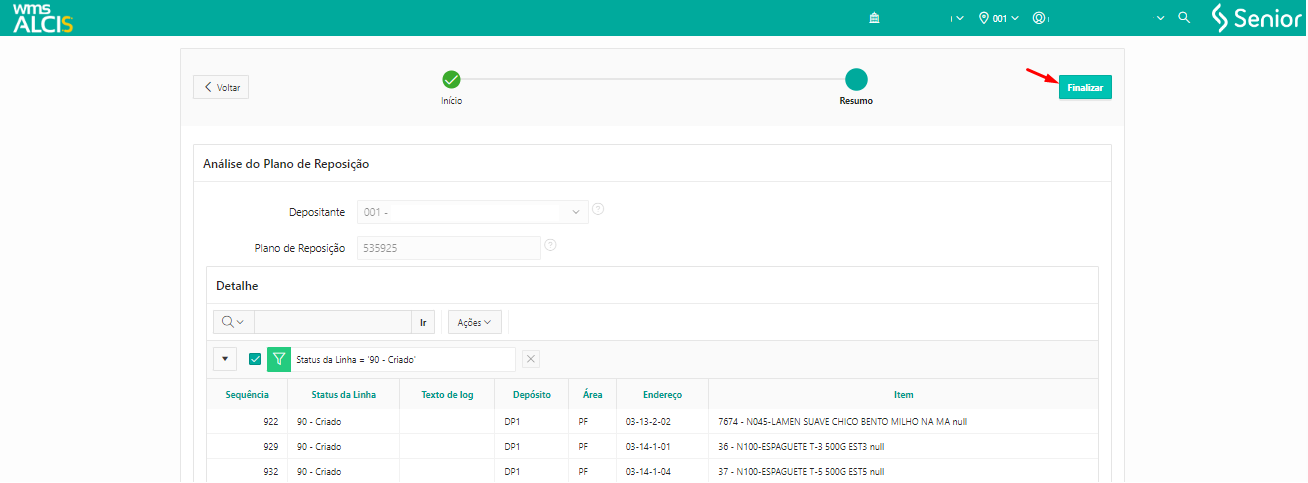 A tela Análise do Plano de Reposição será exibida com o número do plano de reposição, os detalhes do plano e uma mensagem com a quantidade reposições foram geradas e não geradas para os dados informados. Ao clicar em Finalizar, será exibida a tela Missões de Recebimento (NA400) com o número plano de reposição gerado e as tarefas vinculadas ao plano com seus respectivos status.