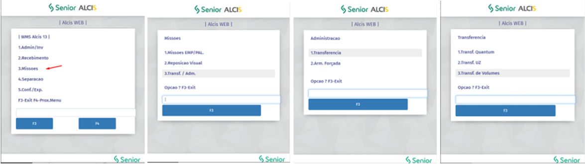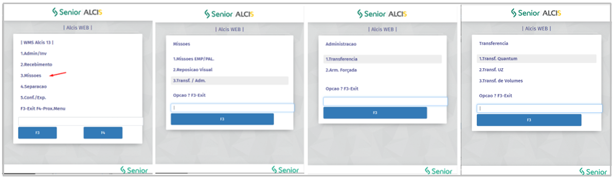 - Acessar o menu 3-Missões > 3-Transf./Adm. > 1-Transferência > 3-Transf. De Volumes;