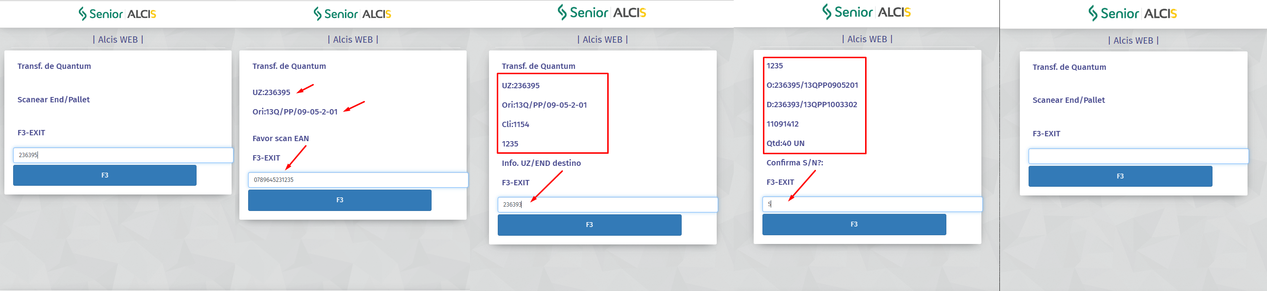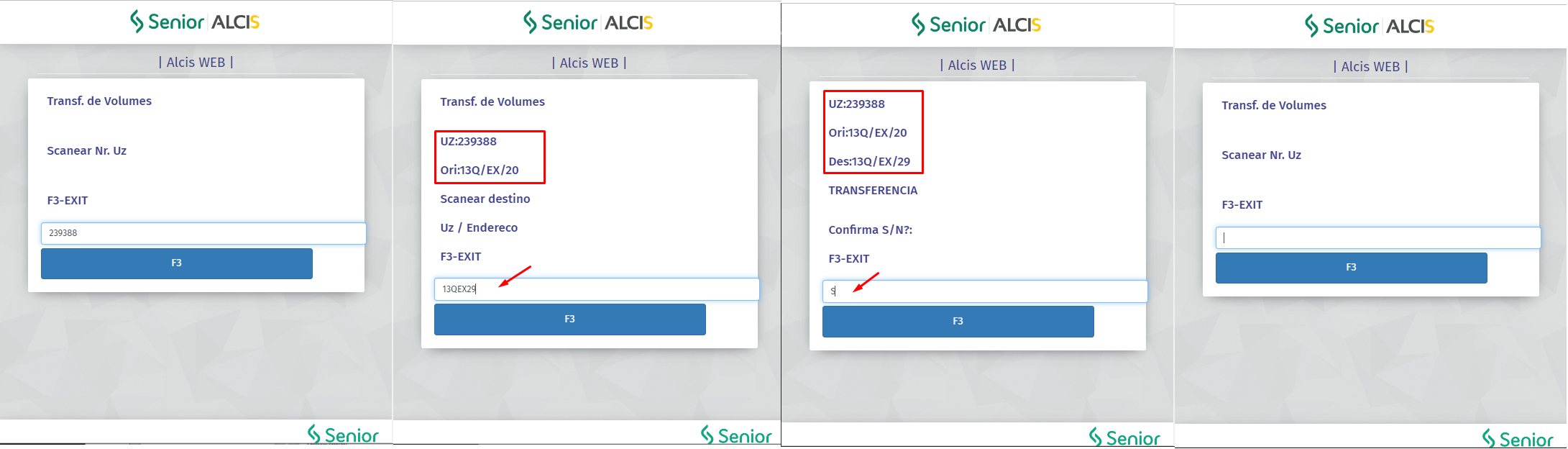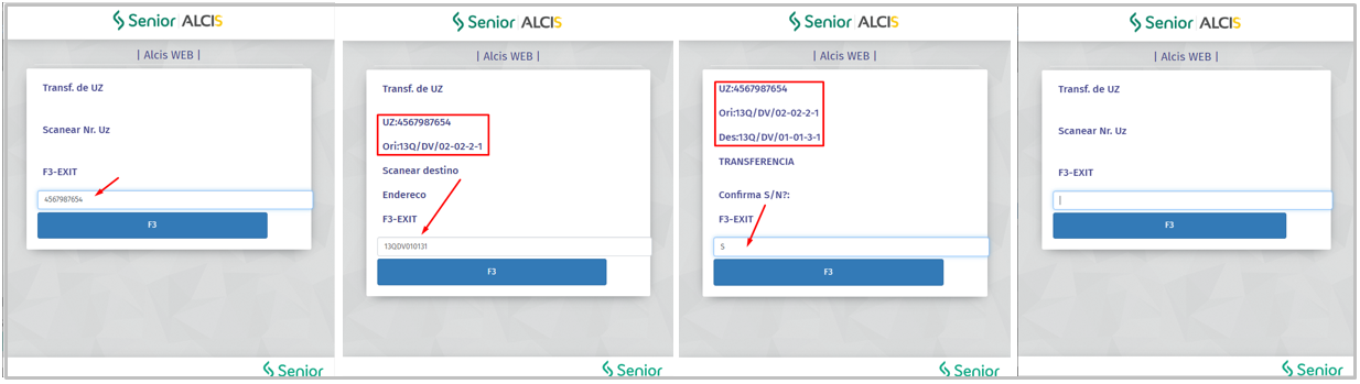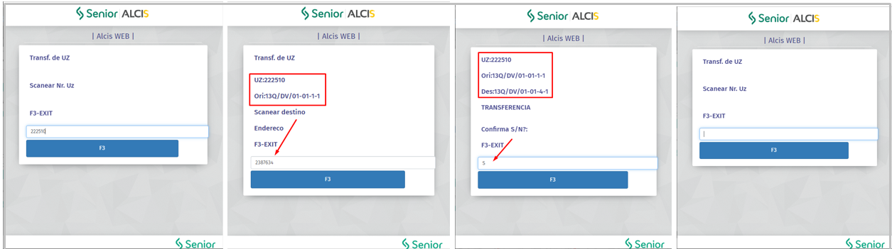 - A tela do coletor será atualizada novamente, com os dados da origem e destino da UZ, e a confirmação da transferência (S/N). Confirmar o processo com "S", o processo será realizado e a tela atualizada para uma nova leitura da UZ.