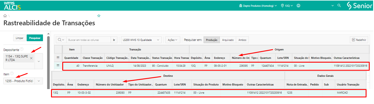 Na tela de Rastreabilidade de Transações (LS300), podemos verificar que foi realizado o registro de transferência de quantum, o código da transação UMLQ e os dados referentes a essa transferência de quantum do produto 1235, que estava na UZ 236395 no endereço de origem 13Q-PP-09-05-2-01 e passou para o endereço de destino 13Q-PP-10-03-3-02 quem tem a UZ 236393.