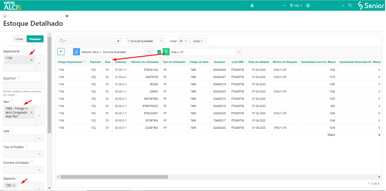 Neste exemplo, realizaremos a transferência da UZ 4567987654 que está no endereço 13Q-DV-02-02-2-1 para o endereço 13Q-DV-01-01-3-1. Na tela Estoque Detalhado (LS200), através do campo Depositante e um filtro secundário na coluna Área, localizamos as informações necessárias para efetuar o processo de transferência de UZ.