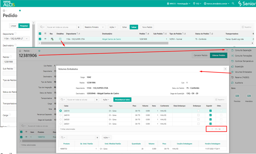 Em Expedição > Pedido > Pedidos (AK100) realizmos a consulta utilizando os filtros Depositante e Pedido. Em seguida, em Detalhes > Volumes Embalados verificamos que no processo de conferência foram gerados 14 volumes.
