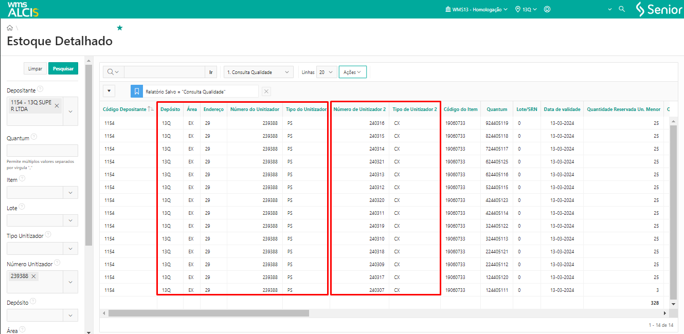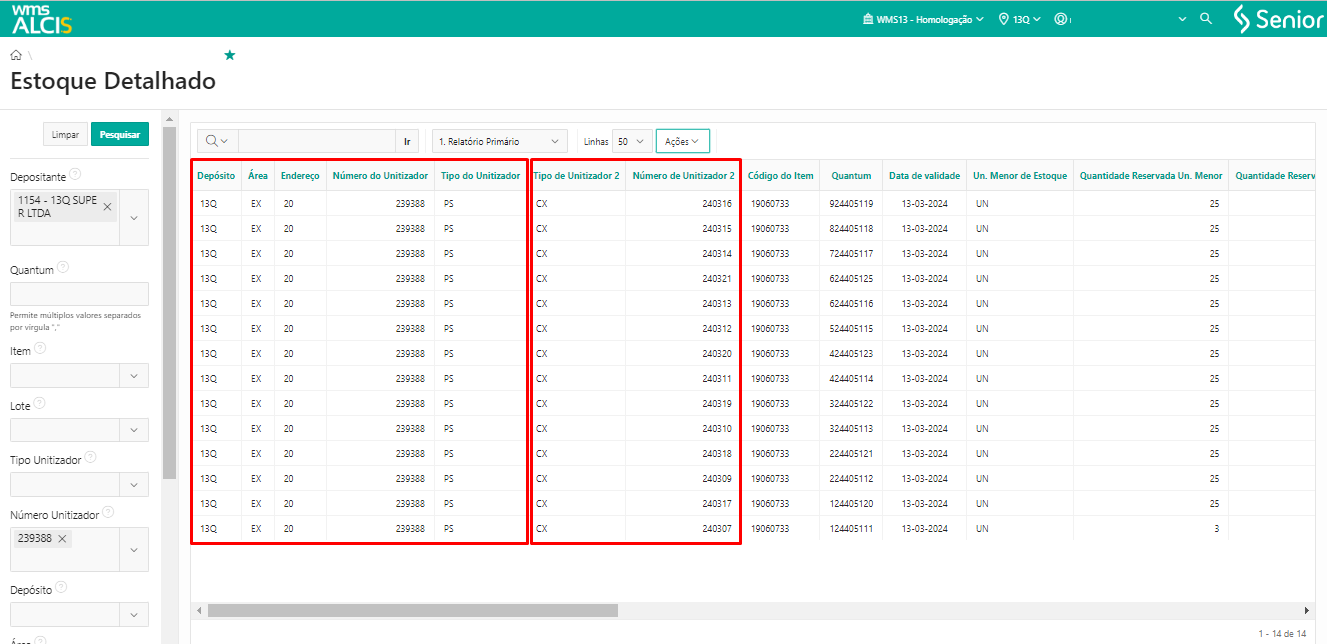Na tela de Estoque Detalhado usando os filtros Depositante e Número Unitizador, podemos verificar que a UZ 239388 do Tipo PS está na Doca de Expedição 20 e nessa UZ temos 14 registros de Unitizador do tipo CX nível 2 que indicam os volumes gerados no processo de conferência.