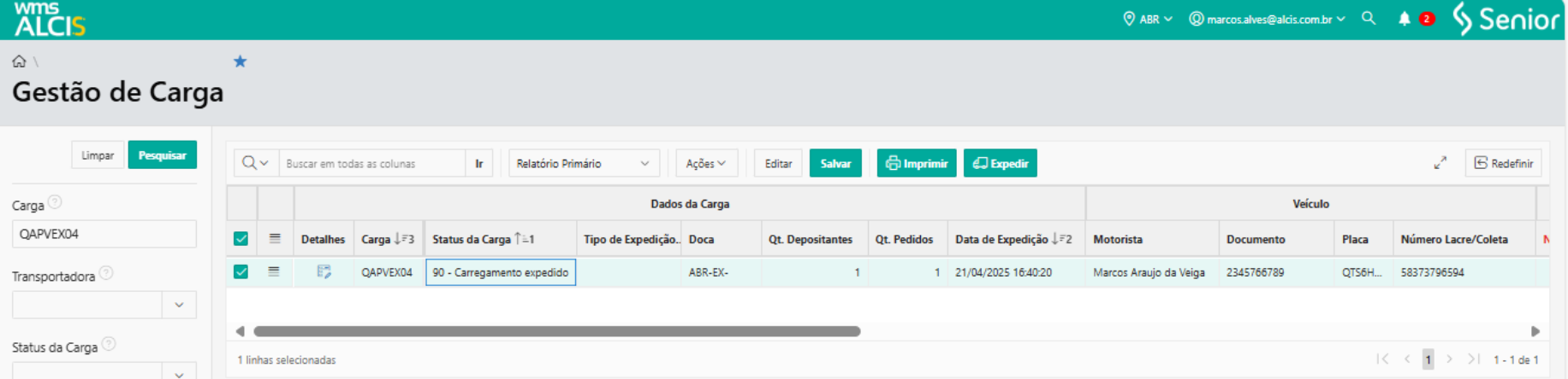A tela será atualizada com os dados da nossa carga, podemos verificar que o status da carga está como 32 – Fim Conferência.
