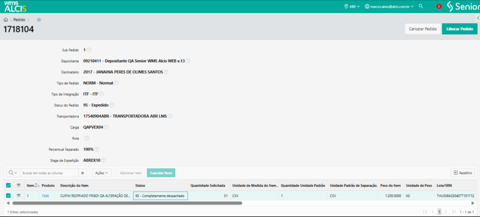 Atualizando a consulta na tela de Pedido podemos verificar que o status do pedido 1718104 foi atualizado para 95 – Expedido.
