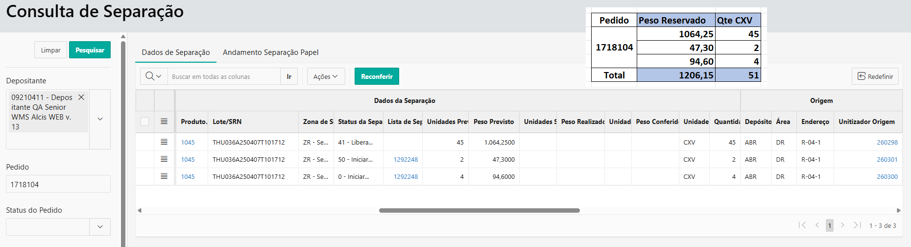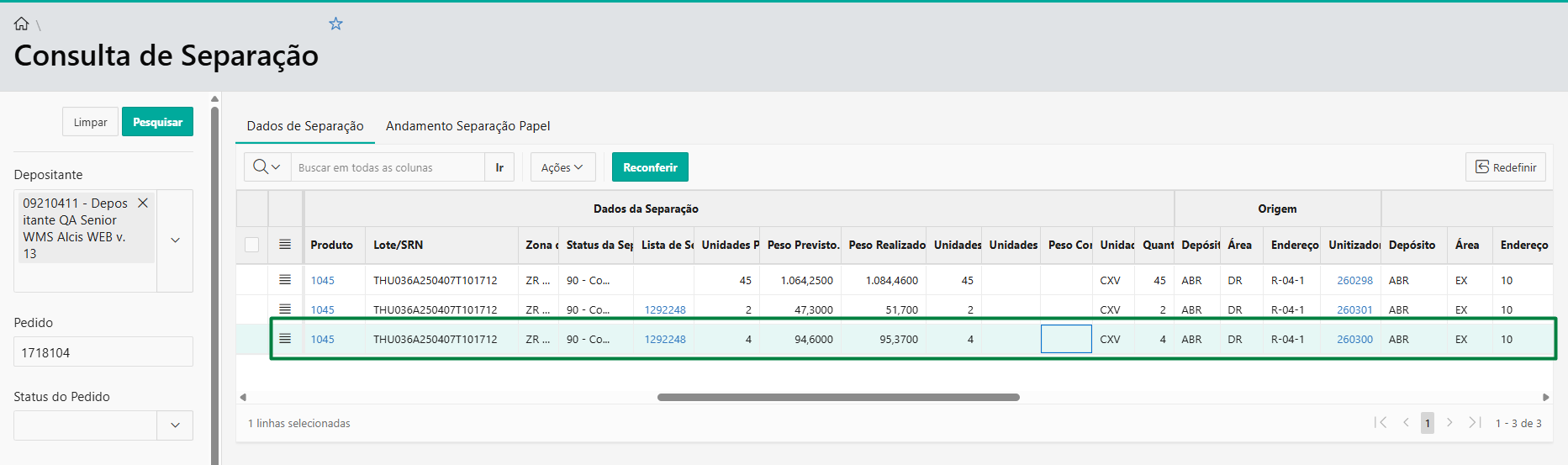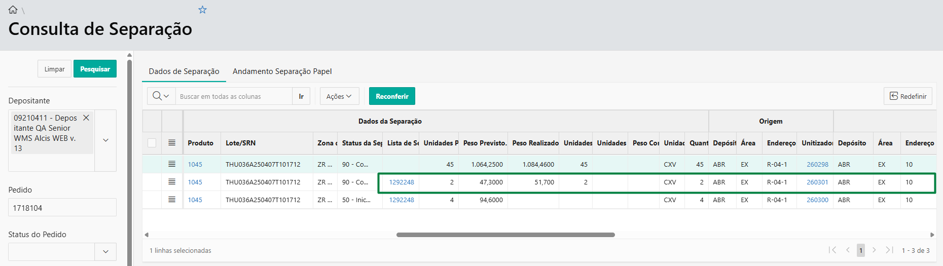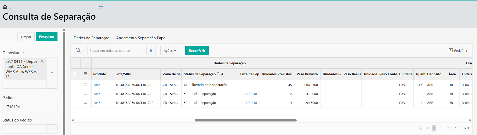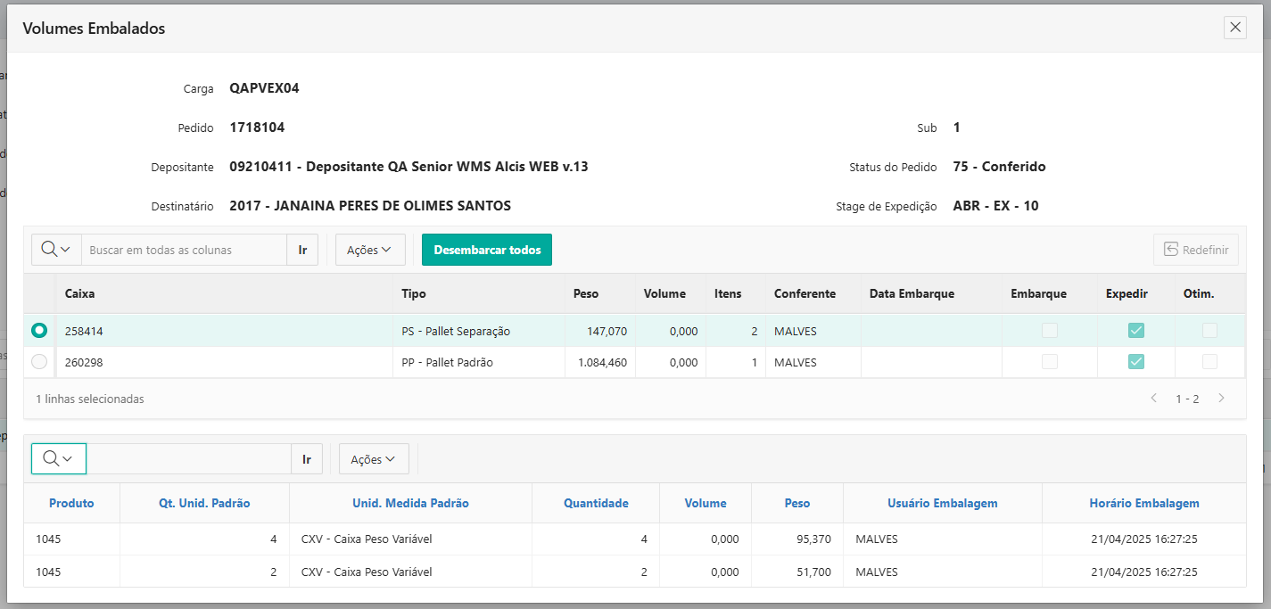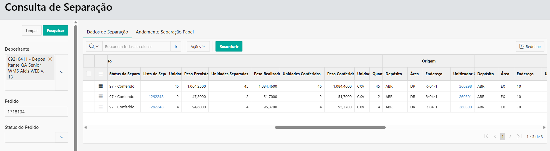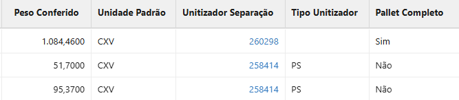 - Nessa tela temos os dados dos volumes que foram gerados no processo de conferência.