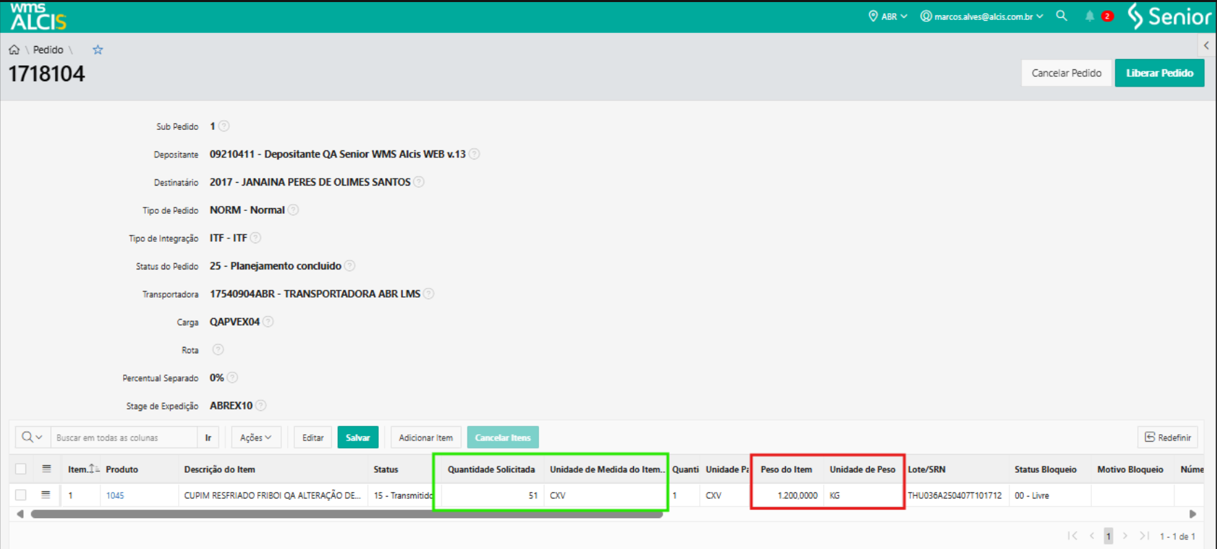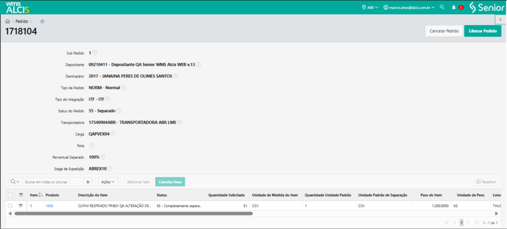 Clicando em Detalhes será exibida a tela com os detalhes do nosso pedido, onde podemos verificar que o status da linha do produto foi atualizado para 95 – Completamente Despachado.