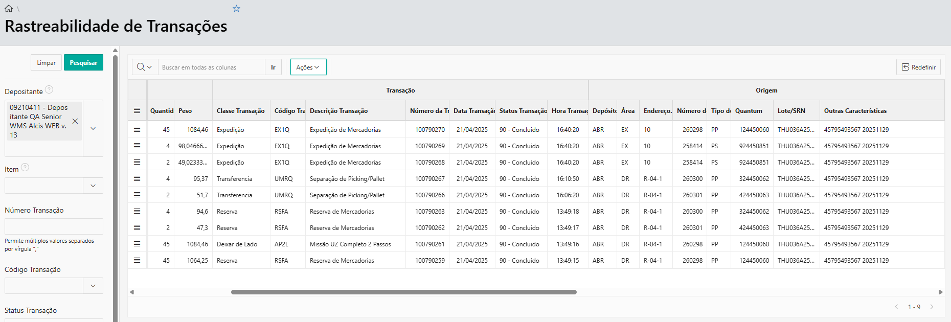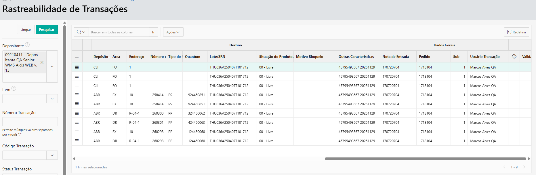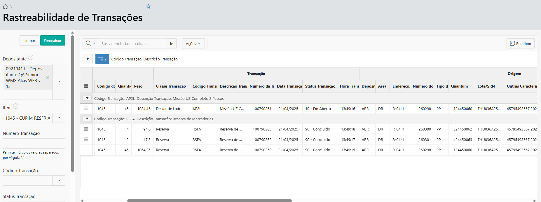 Ainda na mesma tela no campo superior direito temos o ícone Expandir / Recolher Coluna Lateral, clicando nele podemos efetuar a consulta na tela de Rastreabilidade de Transações, clicando Transações Realizadas, ao exibir a tela podemos verificar os registros de todas as transações que foram realizadas para atender nosso pedido: