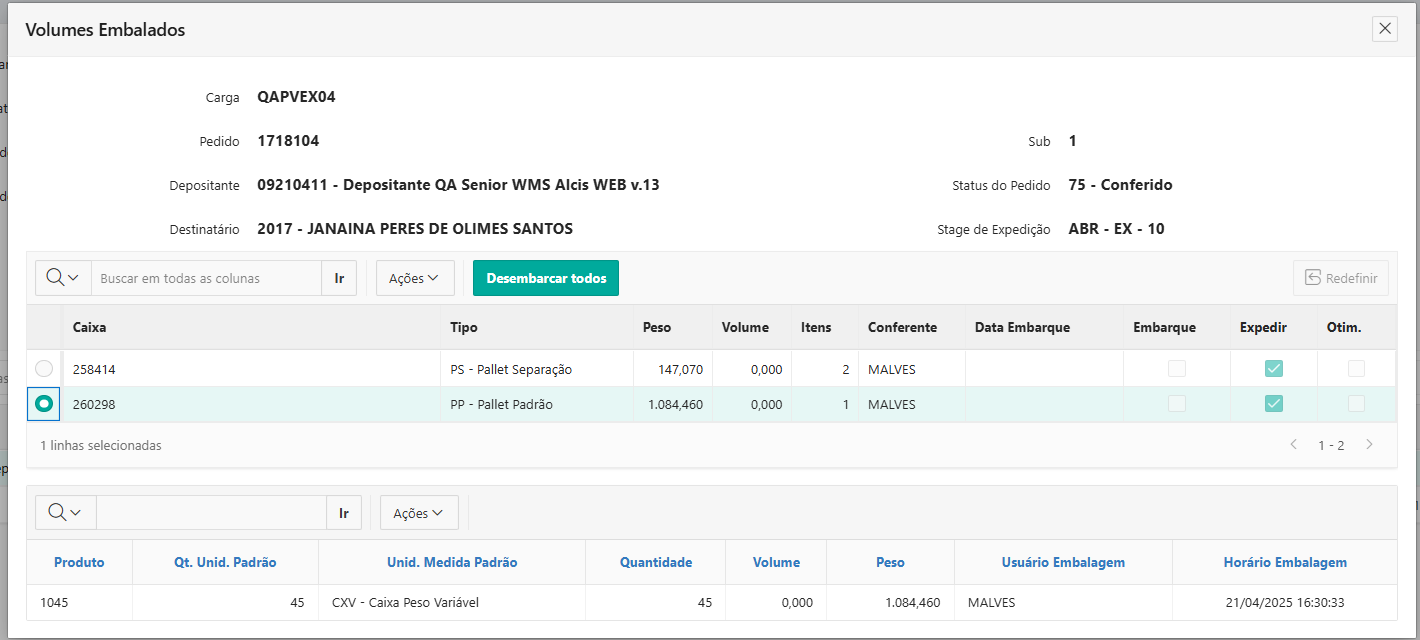 Abaixo imagem da tela de Volumes Embalados, onde podemos verificar todos os dados e campos já mencionados preenchidos.