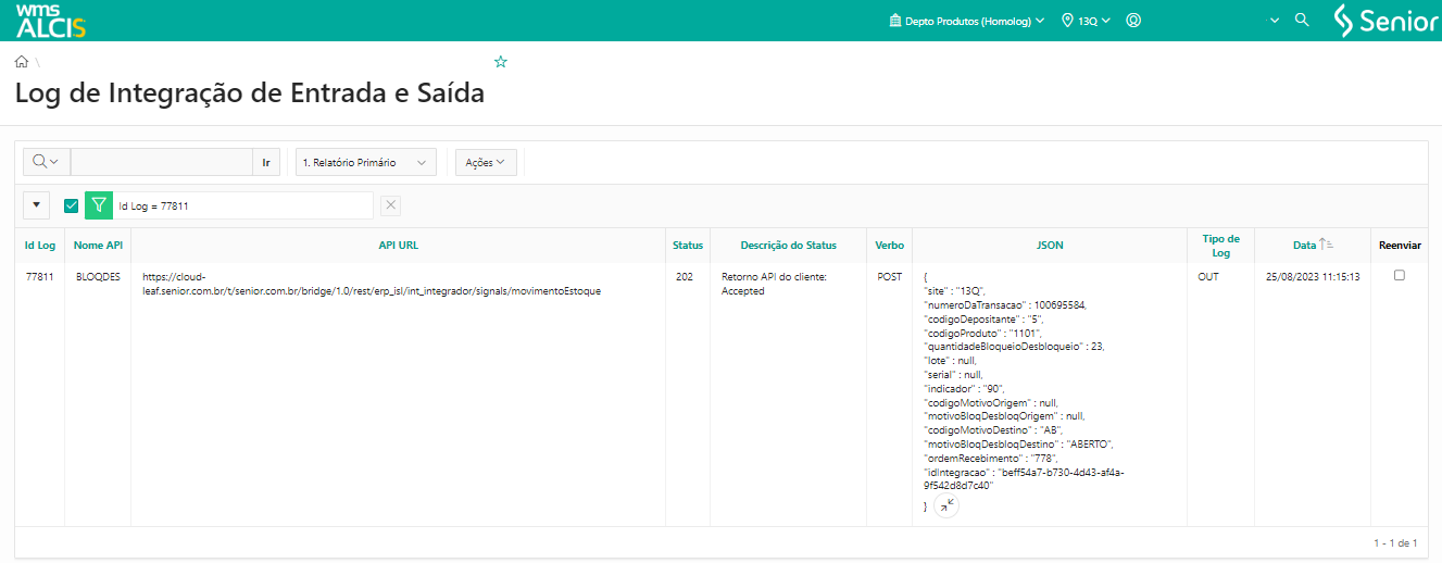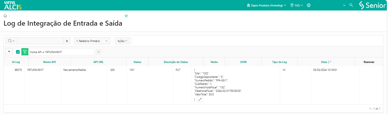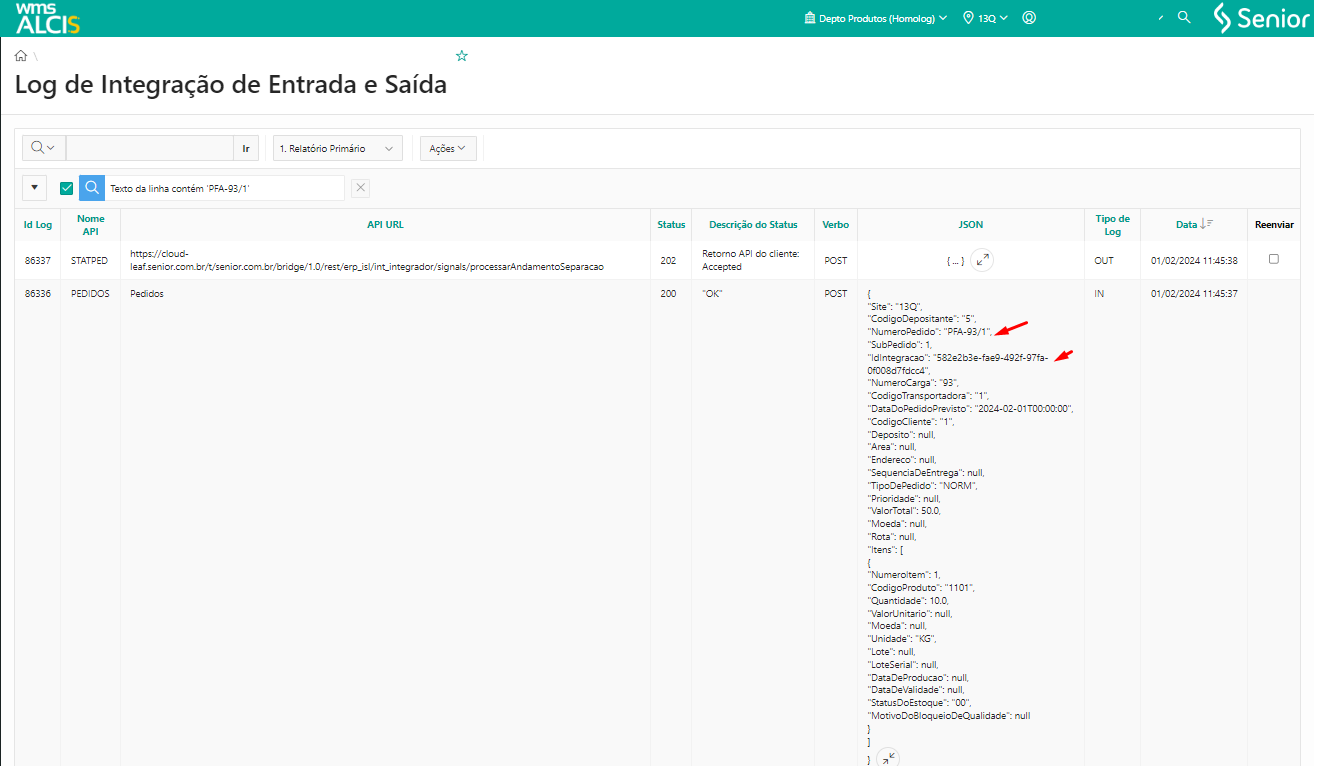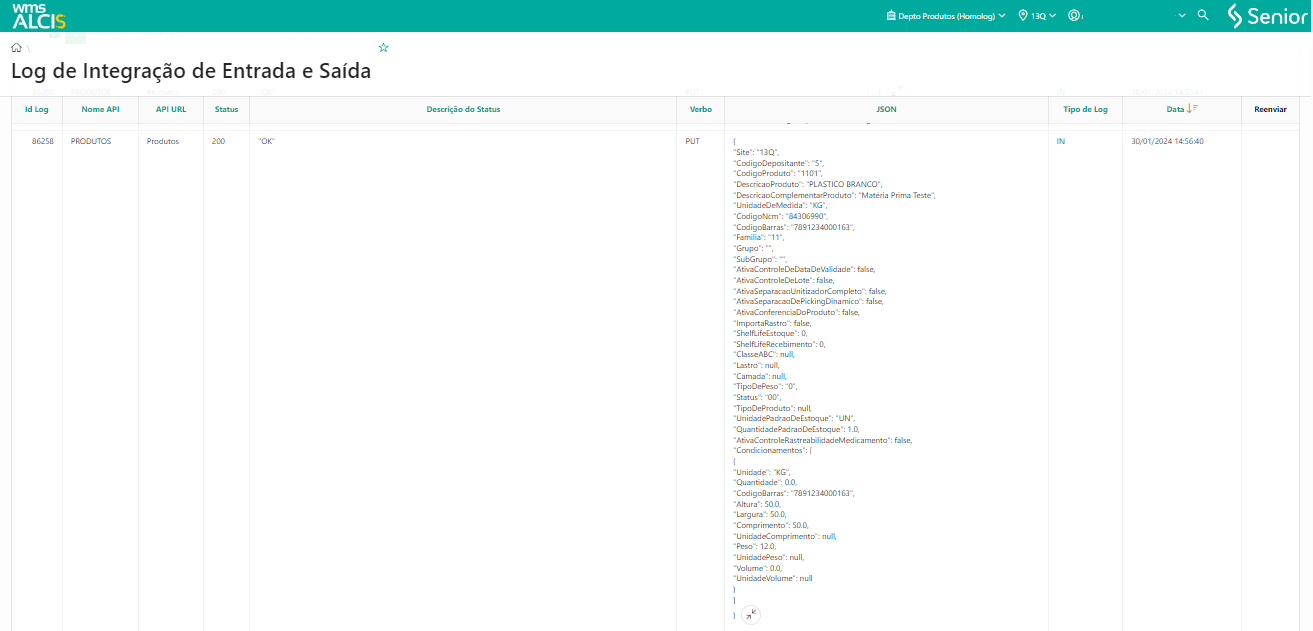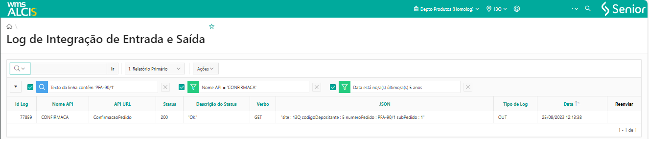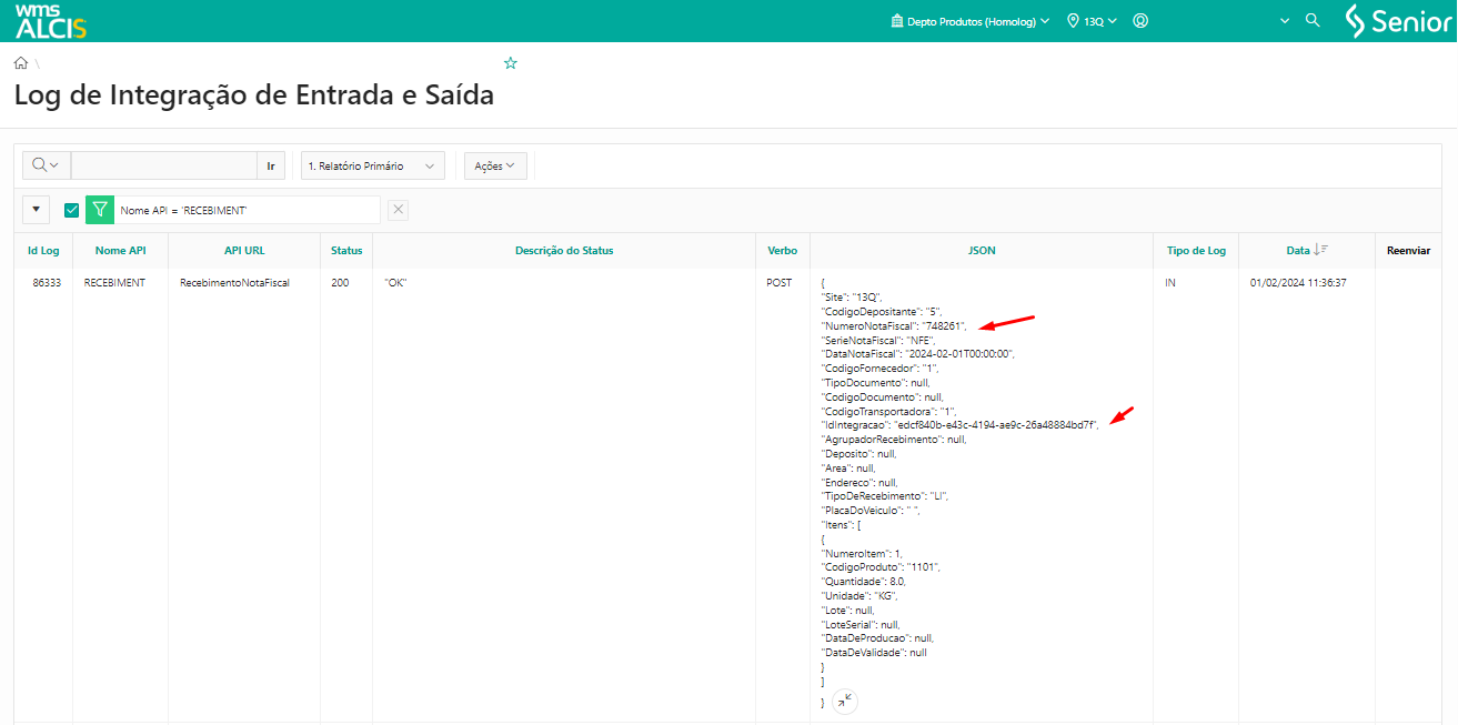 Processo integrado (automático) com origem no ERP (Gestão Empresarial | ERP) e Retorno do Senior WMS Alcis Web