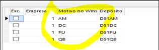 | WMS - Código de bloqueio | Descrição | ERP - Código de Bloqueio | Imagem do registro no ERP |