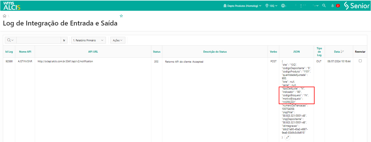 - Estoque Bloqueado com ajuste positivo: o campo tipoDeAjuste é enviado como N e o campo Indicador de Bloqueio é enviado como 90. Os campos codigoBloqueio e motivoBloqueio também são preenchidos.