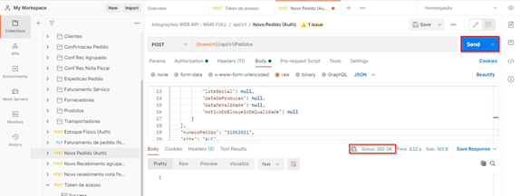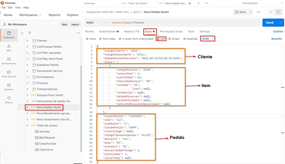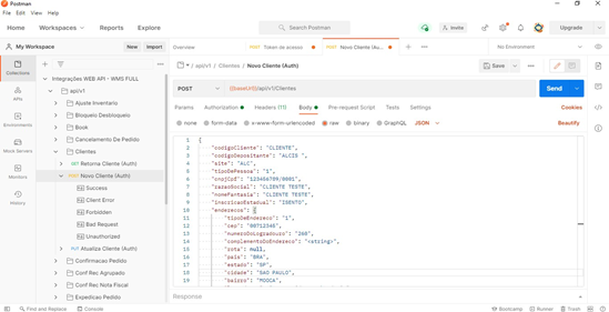 Para realizar consultas deve-se acessar no WMS a tela SY700 e colher a informação dos valores no quadro JSON. No Postman dependendo do tipo de API será solicitado valores referentes a transação como por exemplo, número do pedido, número da transação, site, código do depositante etc.