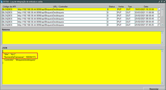 Acessando a SY700 e pesquisando por BLOQDES no quadro JSON temos os valores referente a transação.